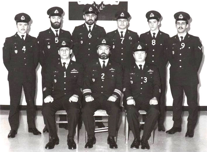 (1) Webb, R., CPO2 (Instructor) (2) Jones, T., LCdr (Sub School CO) (3) Griffin, K., PO1 (Instructor) (4) Harris, OS (5) Rollin, L., LS (6) Franz, AB (7) Reid, AB (8) Dugas, AB (9) Beaudoin, AB