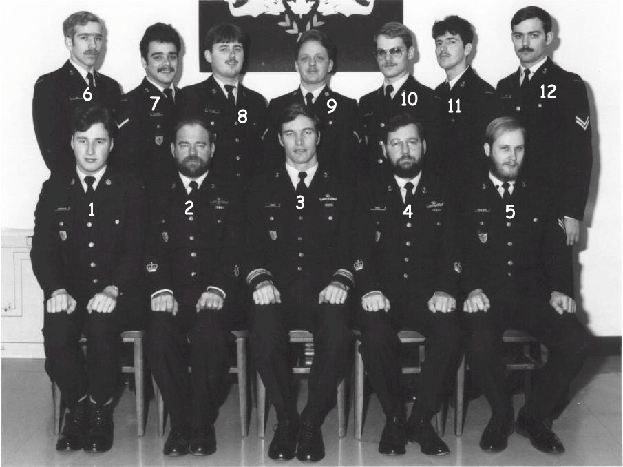 (1) Robinson, R. (2) Bradshaw, W., PO1 (Instructor) (3) Embree, S., LCdr (Sub School CO) (4) Rody, Phil, PO1 (Instructor) (5) Grundel, Ralph Mario, MS (6) Lee, B (7) Laprade, J. (8) Ballard, J. (9) Hallonquist, G. (10) Crowell, K. (11) Lyle, R. (12) Conrad, M.