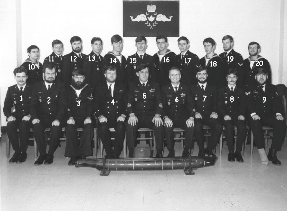 (1) Beek, OS (2) Arbour, OS (3) Downie, LS, RAN (4) Laurence, CMEA, RN (5) Sullivan, G., CPO1 (6) Halvorson, T., PO1 (7) Blondin, OS (8) Merrette, OS (9) Cleal, Bill, LS (10) Smith, AB (11) Logan, Pte (12) Waters, OS (13) Desjardin, OS (14) McGrouder, AB, RAN (15) McClaughun, LS (16) Forster, AB (17) Blanchette, AB (18) Munn, AB, RAN (19) Hayes, Isaac, AB (20) Breden, AB