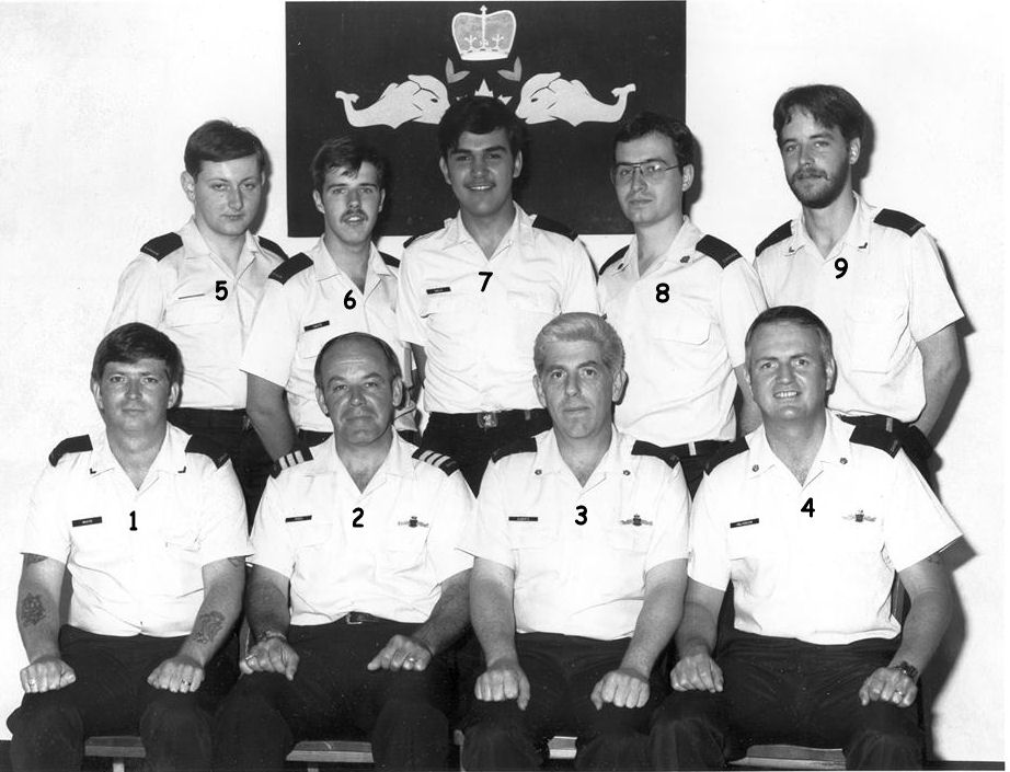(1) White, AB (2) Perks, R., Cdr (3) Alberts, J., PO1 (Instructor) (4) Halvorson, T., PO1 (Instructor) (5) Baldwin, Pte (6) Shute, OS (7) Hazle, OS (8) Weis, MS (9) Brayman, AB