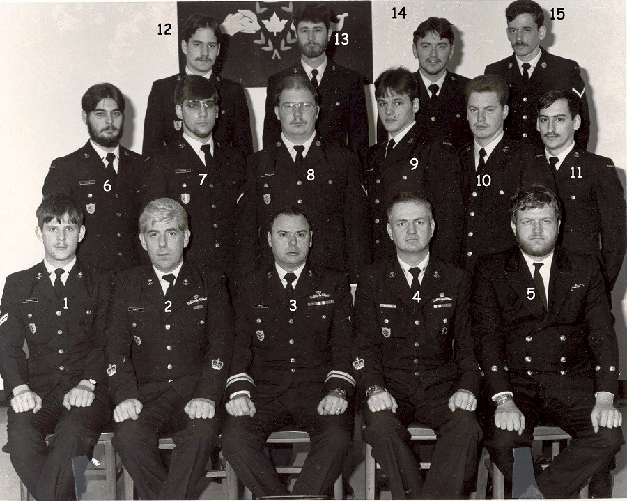 (1) Edwards, LS (2) Alberts, J., PO1 (Instructor) (3) Wyss, T., Lt (Sub School CO) (4) Halvorson, T., PO1 (Instructor) (5) Lawrence, CPO, RN (Instructor) (6) Uhler, AB (7) Benoit, OS (8) Manley, AB (9) Godin, OS (10) Roth, OS (11) Desrochers, OS (12) Reid, OS (13) SInclair, OS (14) Gales, OS (15) Saunders, AB