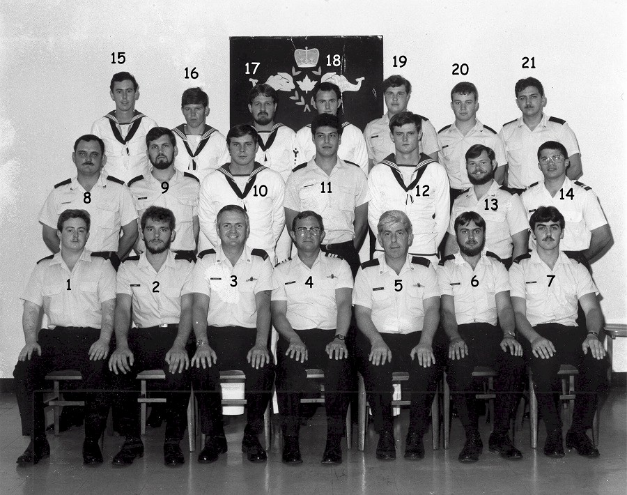 (1) Clahane, P., OS (2) Bowie, J., OS (3) Halvorson, T., PO1 (Instructor) (4) Nesbit, K., Cdr (Sub Squadron CO) (5) Alberts, J., PO1, (Instructor) (6) Champagne, J., OS (7) Aube, J., OS (8) MacNeill, R., LS (9) Walker, W., OS (10) Shorter, M., AB (11) Hom, Bill., LS (12) Wiles, A., SM (13) Wilson, R., LS (14) Vargas, Slt (15) Norman, P., LS (16) Caldwell, T., SM (17) James, G., LS (18) Ribgy, M., SM (19) Winter, E., OS (20) Wallace, R., AB (21) Young, A., LS