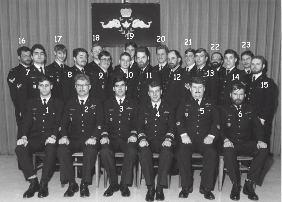 (1) Stewart, OS (2) Downie, R., PO1 (Instructor) (3) Shergold, Lt (4) Bowden, Lt (5) Presley, W., PO1 (Instructor) (6) Toole, LS (7) Maltais, Cpl (8) Nolan, OS (9) MacMillan, OS (10) Wensel, OS (11) Connolly, OS (12) Womack, J., PO2 (13) Fraser, WO (14) McMullen, OS (15) Bernard, OS (16) Cormier, LS (17) Lawson, OS (18) Jodoin, MS (19) Ryman, OS (20) Benoit, LS (21) Wensell, MS (22) Guitar, OS (23) Wheaton, OS