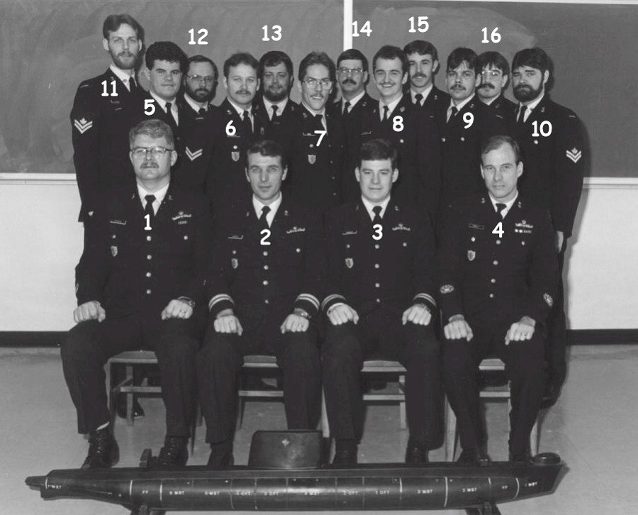 (1) Downie, Robert, PO1, Inst (2) Bowden, Keith, Lt, Course Officer (3) Truscott, Randy, Lt, Inst (4) Stoakley, Charles, CPO2, Inst (5) Howell, Thomas, OS.ER (6) Unknown (7) Unknown (8) Boileau, Richard, OS.CK (9) Unknown (10) MacDonald, Ron, OS.ET (11) Conrad, Brian (possibly) (12) Moore, John, OS.ET (13) Egilsson, Mike, OS.ER (14) Aylward, Joe, OS.SN (15) Rimmer, David, OS.ET (16) Unknown