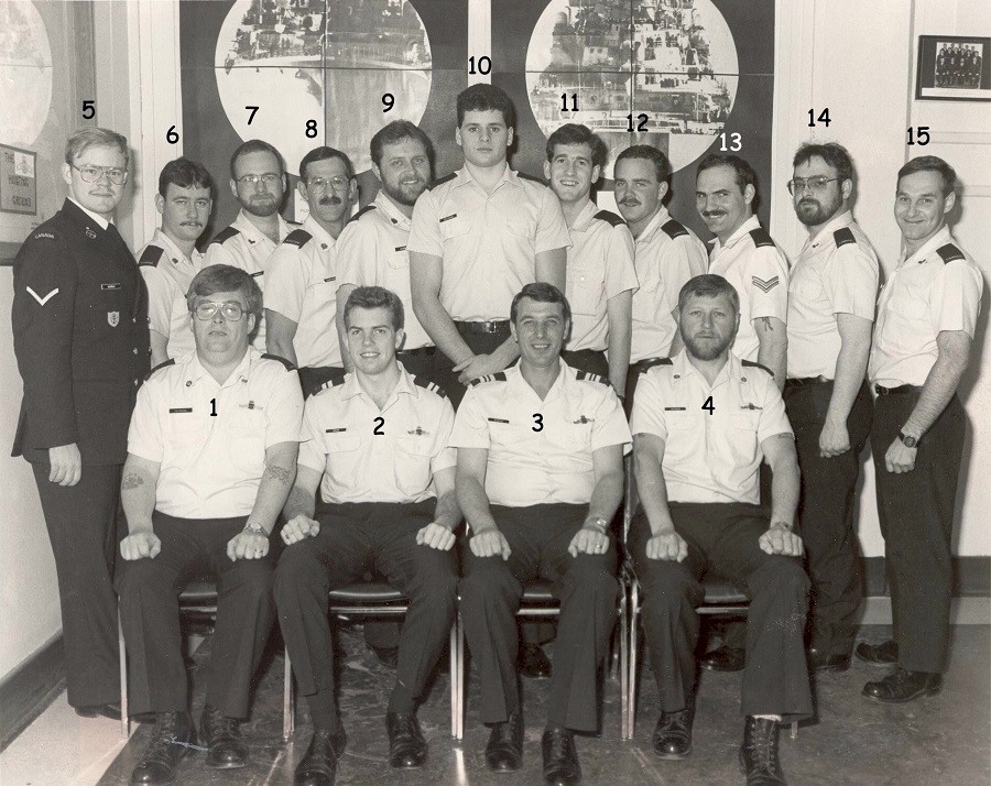(1) Patterson, PO1 (Instructor) (2) Virgin, Lt (3) Bowden, LCdr (4) Byzerski, CPO2 (5) Murray (AB) (6) Callaghan, MS (7) Charles, LS (8) Compagnat, Sgt (9) Lesiuk, PO2 (10) Bertrand, OS (11) Lamontagne, OS (12) Lajoie, OS (13) Bienvenu, LS (14) Parrott, LS (15) Bouchard, LS