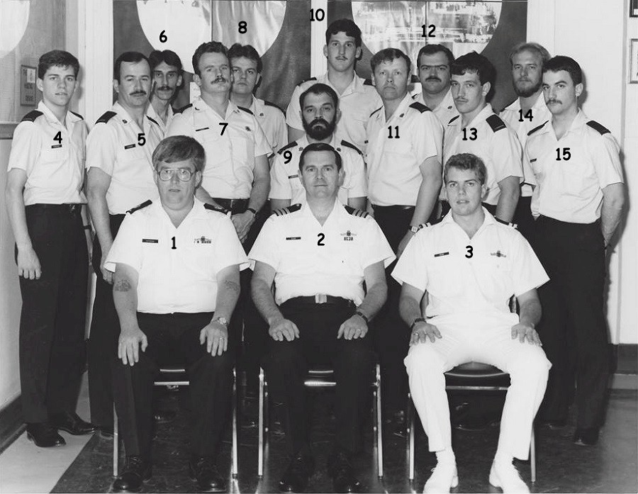 (1) Patterson, PO1 (Instructor) (2) Sloan, Cdr (Sub Squadron CO) (3) Virgin, Lt (Sub School Officer) (4) Perrault, OS (5) Raboin, Sgt (6) Fleury, LS (7) Clorey, LS (8) Wilson, MS (9) Lamoreux, PO2 (10) Doyle, O/C (11) Steele, Sgt (12) Simms, MCpl (13) Tanguay, OS (14) Best, OS (15) Valiquette, OS