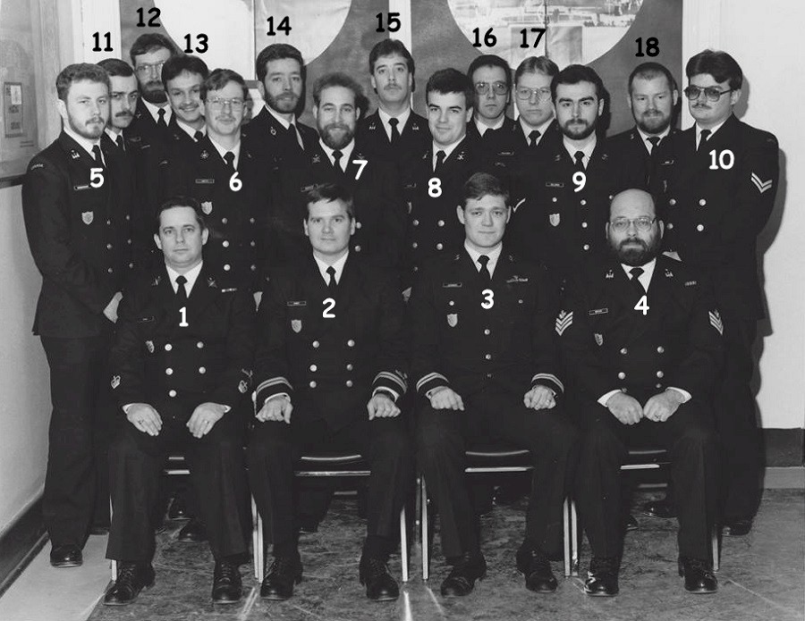 (1) O'Hara, T., PO1 (Instructor) (2) Babic, M., Lt (3) Kavanaugh, P., Lt (4) Braun, J., PO2 (7) Bourassa, P., OS (8) Blouin, J., OS (9) Holloran, C., AB (12) Cleavely, R., LS (13) Courchesne, J., OS (14) O'Keefe G., LS (18) Gray, C., LS *Others on course but # not identified: LS R. Codner, OS J. Burns, OS C. Cunningham, OS J. McClennan, LS S. Smith, AB F. Robinson, OS D. Walmsley