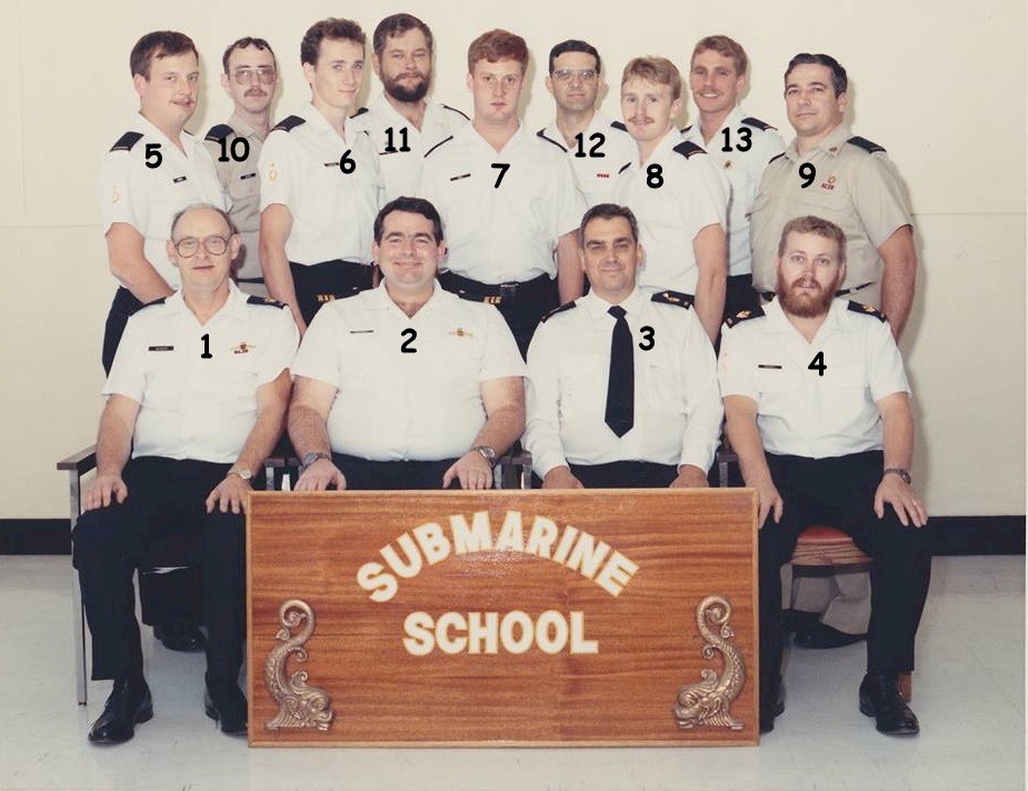 Oberon Class Basic Submarine Course # 8904 Course Dates unknown (1) Schatz, Fred, PO1 (Inst) (2) MacDonald, Drew., LCdr (Course Officer) (3) Lake, Rodney, PO1 (Inst) (4) Randall, Edgar, MS (Inst) (5) Connors, Brad, AB.ET (6) Levesque, Tom, OS.ER (7) Biss, John, LS.RM (8) Biggin, Dwayne, OS.ER (9) Lamarche, Robert, SGT PA (10) Sparks, Vernon, CPL CK (11) May, Bruce, PO2.RM (12) Heon, J.P. OS.NET, (Did not finish Course) (13) Cawthra, Norman, MS.RM Submitted by Brian Lapierre