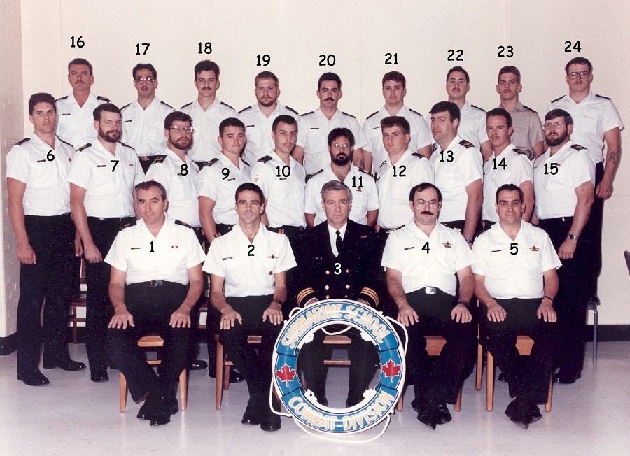 (1) Audette, CPO2 (Instructor) (2) Gunning, Lt (3) Neild, Cdr (4) Irvine, LCdr (5) Lake, PO1 (Instructor) (6) Huxley, OS (7) Blair, PO2 (8) Andrews, MS (9) Snelgrove, LS (10) Theriault, OS (11) Woodhouse, PO2 (12) Johnson, AB 913) Buck, MS (14) Fellows, MS (15) Tower, MS (16) Kimbers, MS (17) Crosate, OS (18) Albert, AB (19) Ethiere, OS (20) Clahane, LS (21) Stephenson, OS (22) Kalyn, LS (23) Ivany, Pte (24) Morneau, OS