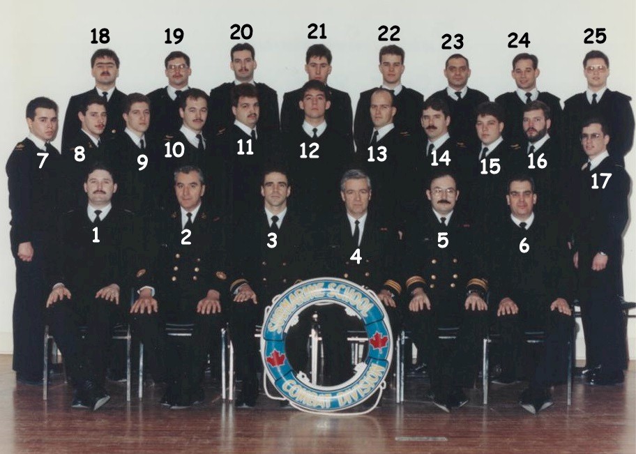 (1) Murphy, Gary, MS.RP (2) Audette, "Moose", CPO2, Inst (3) Gunning, William, Lt, Inst (4) Neild, Cdr (5) Irvine, William, LCdr, Course Officer (6) Lake, Rodney, PO1, Inst (7) Bourgeois, Cabe, MS (8) Bigras, M.J., OS.WU (9) Davis, Joshua, OS.SN (10) Godin, J.G., LS.WU (11) Halliday, Warren, LS (12) Morton, Chris, OS.SN (13) Baldwin, D.D., LS.SN (14) Hogan, Mike, LS. SUP (15) Harding, Jeff, LS.WU (16) Campbell, Derek, OS (17) Fines, Michael, OS.SN (18) Campbell, David, OS.WU (19) MacMaster, Archie, LS.SN (20) Tremblett, G.P., LS.ET (21) Rabouin, Stephane, OS.ER (22) Duff, David, OS (23) Possibly Pilon, Richard, LS.SW (24) Possibly Burnham, Tim, OS (25) Forrest, Vernon, LS.ET