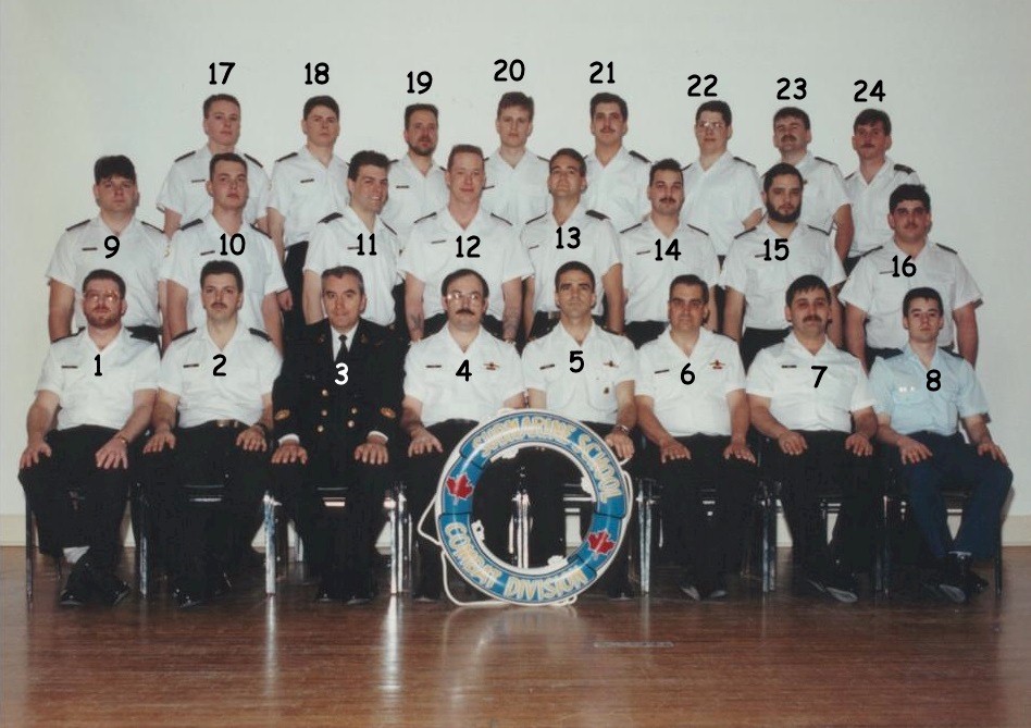 (1) Turpin, Dion, LS (2) Unknown (3) Audet, CPO2 (4) Irvine, William, LCdr (5) Gunning, William, Lt (6) Lake, Rodney, PO1 (7) Hunt, Dave, LS (8) Trembley, Cpl (9) Savard, Patrice, OS (10) Allum, David, OS (11) Kidd, John, OS (12) Norton, Dave, LS (13) Cox, Ken, OS (14) Marcotte, Stephane, OS (15) Unknown (16) Sweetland, Dwayne, OS (17) Deschambault, Rick, OS (18) MacInnis, Paul, OS (19) Berglund, Wade, LS (20) Simmonds, Mike, OS (21) Sheppard, Mike, OS (22) Karsch, Stephane, LS (23) Gillespie, Al, LS (24) White, Dan, LS