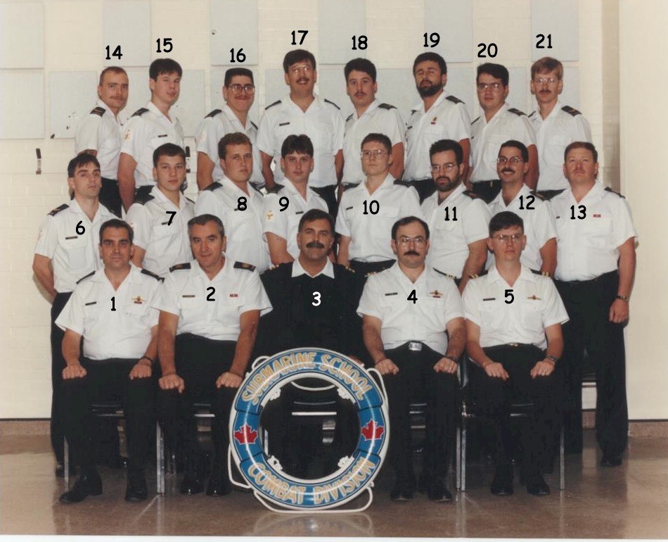 (1) Lake, Rodney, PO1, Inst (2) Audette, "Moose", CPO2, Inst (3) Pickford, John, Cdr, CFNOS Commandant (4) Irvine, William, LCdr, Course Officer (5) Dickenson, Chris, Lt, Inst (6) St. Jules, Yvan, LS.SN (7) Blue, Bryan, OS.ER (8) Mullen, Tyler, OS.ER (9) Bonneau, Eric, OS.ER (10) Wright, J. Todd, OS.ER (11) Hebert, Marc, MS (12) Sylvin, Mike, PO (13) MacIntosh, Randy (14) Pilon, Richard, LS.SW (15) Arnold, Don, OS.WU (16) Whitten, Trevor, OS.SN (17) Stevenson, Todd, LS (18) Rossignol, Serge, OS.ET (19) Winsor, Chuck, AB.SN (20) Quesnelle, H.J. Mark, LS.SN (21) Stewart, Craig, AB.SN