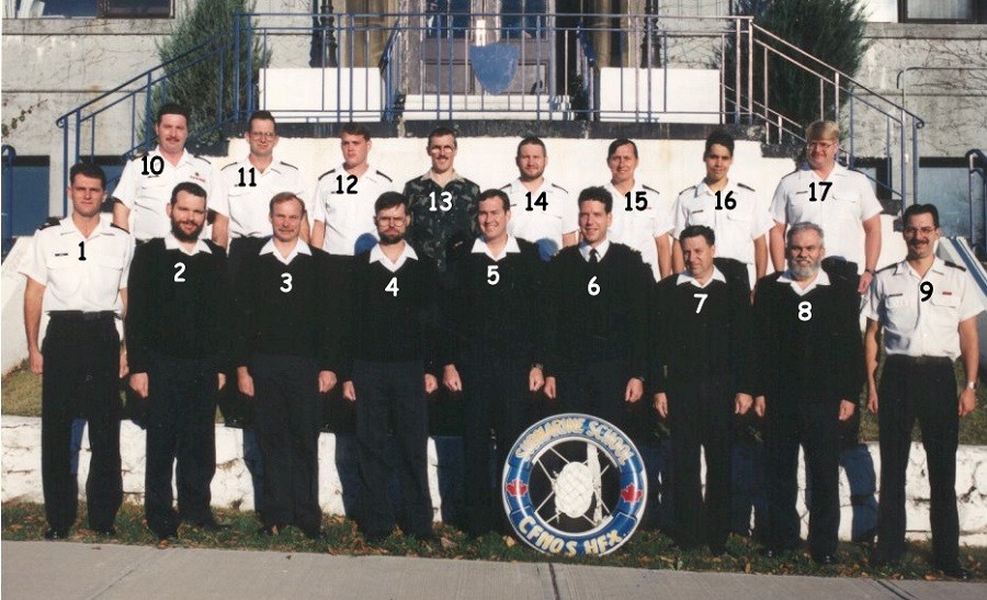 (1) Mavor, Bruce, LSWU (2) Bowie, Jim, OSSN (3) Haddock, Joe PO1 (Inst.) (4) Goodman, K., PO1 (Inst.) (5) Woodburn, Bill (Lt) (6) Unknown (7) O'Dwyer, J., PO1 (Inst.) (8) Allard, M., PO2 (Inst.) (9) Unknown (10) McNeil, Tom (11) Boniface, M., MS (12) Jensen, Blair., OSNWT (13) Lohnes, J., MCpl (14) Gingras, Tyson, LSSN (15) Beaupre, Roger, PO, NET(A) (16) Gelinas, Luc, AB.SN (17) Cleghorn, George, MS