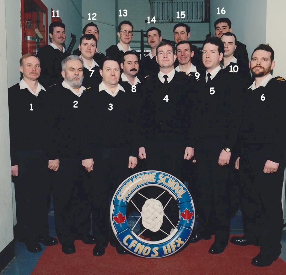 (1) Haddock, Joseph, PO2, Inst (2) Allard, Moe, PO2, Inst (3) O'Dwyer, John PO1, Inst (4) Woodburn, William, LCdr, Course Officer (5) MacLeod, Darrel, LT, Inst (6) Bowie, Jim, OS.SN (7) MacDougall, Kevin, PO.NET (8) King, Louis, LS.NCIOP (9) Castilloux, Dom, PO.NET (10) Ens, Rob, OS.NET(A) (11) Osmond, Ken, LS.ET (12) Strickland, Robert, AB.NET(A) (13) Mayo, David, OS.NET(A) (14) Geddes, Steve, LS.RM (15) Mayo, Roy, LS.ET (16) Ross, K.L., LS.RM