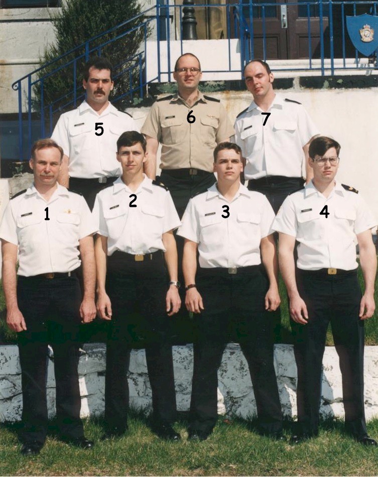 (1) Haddock Joe, PO2 (Instructor) (2) Gallant, Rob (3) Broughton, Scott (4) Provencal, Guy (5) Robinson, Dale (never actually sailed in submarines) (6) Gagnon, Bernard (7) Dumas, Paul