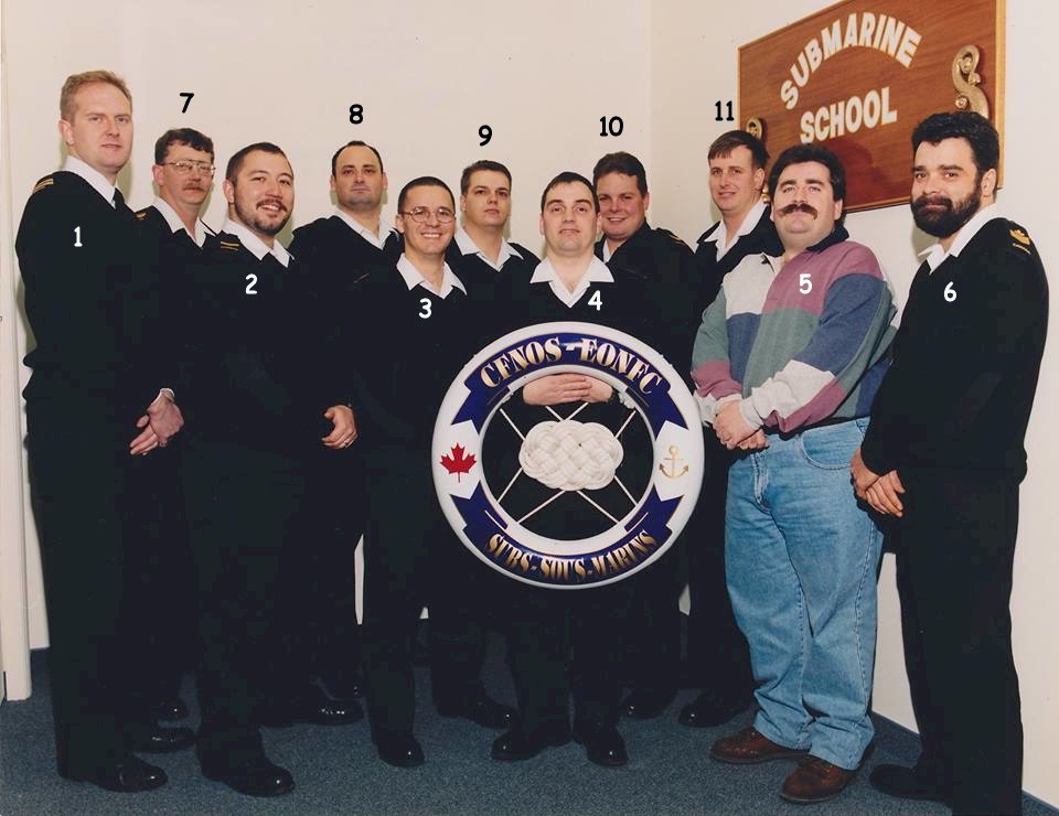 (1) Rankin, Doug, Lt, Course Officer (2) Strickland, Robert, LS NET(A) (3) Osmond, Walter, LS NET(A) (4) St. Jules, Yves, LS.SN (5) Farrell, Darrell, Civilian (6) Laprade, Joe, P2.SN (7) Monk, Brian, C2 NET(S) (8) Coffee, Rick, LS NET(A) (9) Broughton, Scott LS NET(A) (10) Jones, Robert, LS NET(A) (11) Ross, Ian, LS NET(A)
