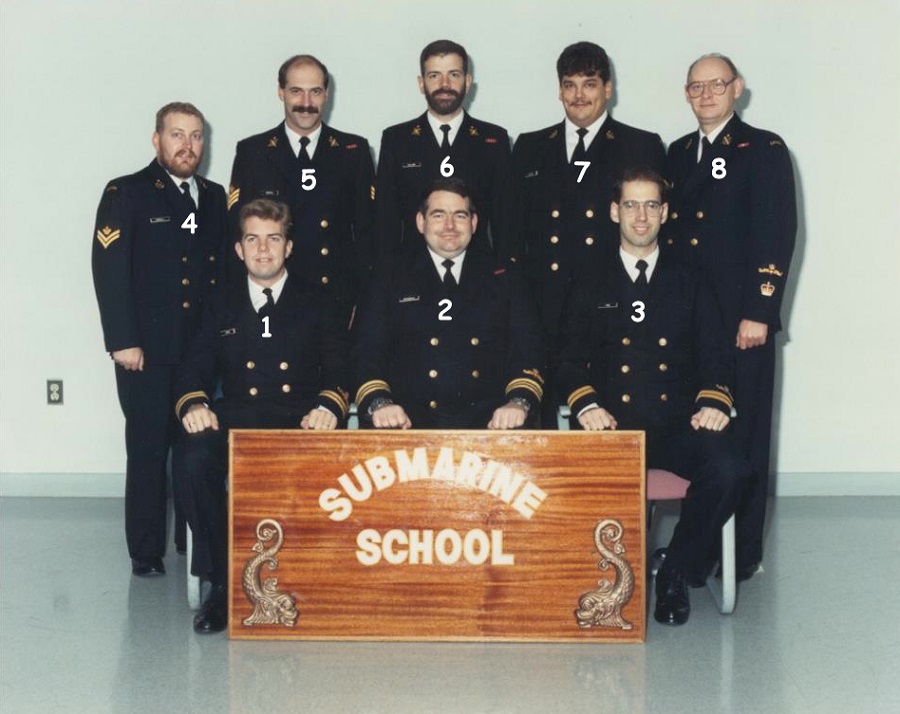 (1) Virgin, Steve, Lt (2) MacDonald, Drew, LCdr (3) Finn, Pat, Lt (4) Randall, Edgar, MS (5) Dockrill, Cy, PO2 (6) Pallard, Marc, CPO2 (7) Tavares, Drew, MS (8) Schatz, Fred, PO1 Note: MS Edgar Randall and MS Drew Tavares were not submariners but were part of the Sonar Trainer Staff