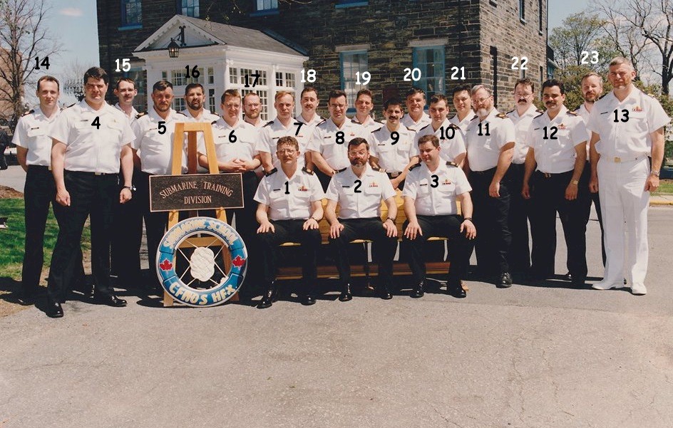 (1) Monk, Brian CPO2 (2) Mosher, Les LCdr (3) Upson, Dan CPO2 (4) Bryan, Peter Lt (5) Venator, Bill PO2 (6) Unknown (7) Haddock, Joe PO2 (8) Hebert, Marc PO2 (9) Landriault, Jeff (10) Unknown (11) Osmond, Marc PO2 (12) LaPrade, Joe (13) Mabbitt, Richard, LCdr (14) Levesque, Tom PO2 (15) Moulton, Andy PO1 (16) Loveless, Ed, PO1 (17) Gregoir, Frank (18) Unknown (19) Wentzel, Willie (20) Grubb, Ian (21) Li, David (22) Unknown (23) Brayman, Daryl
