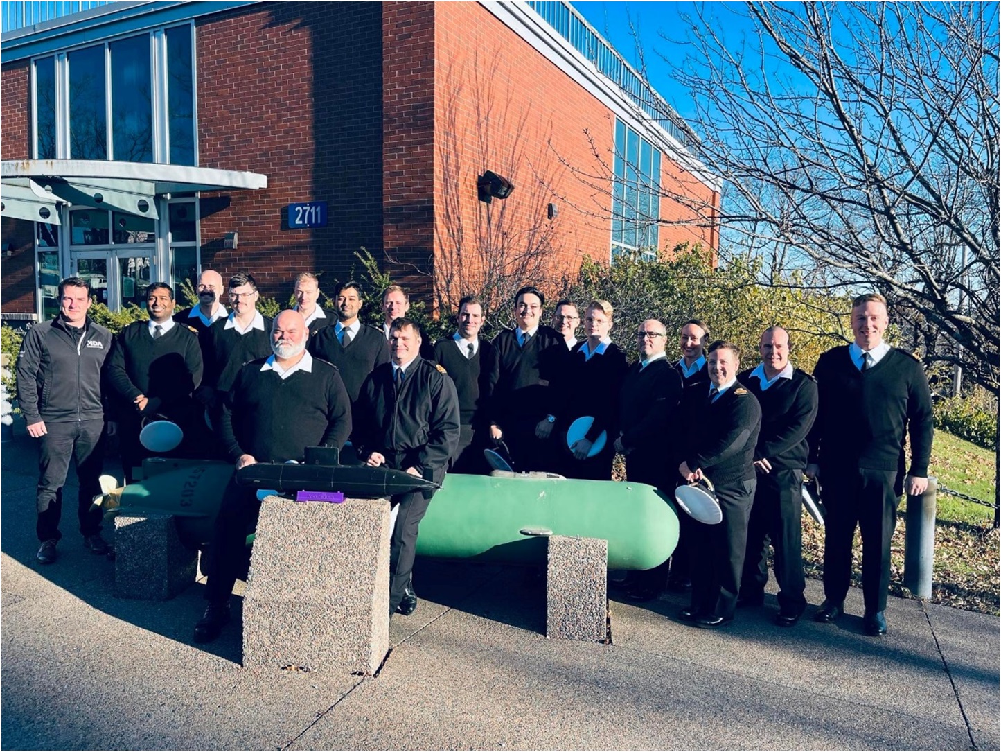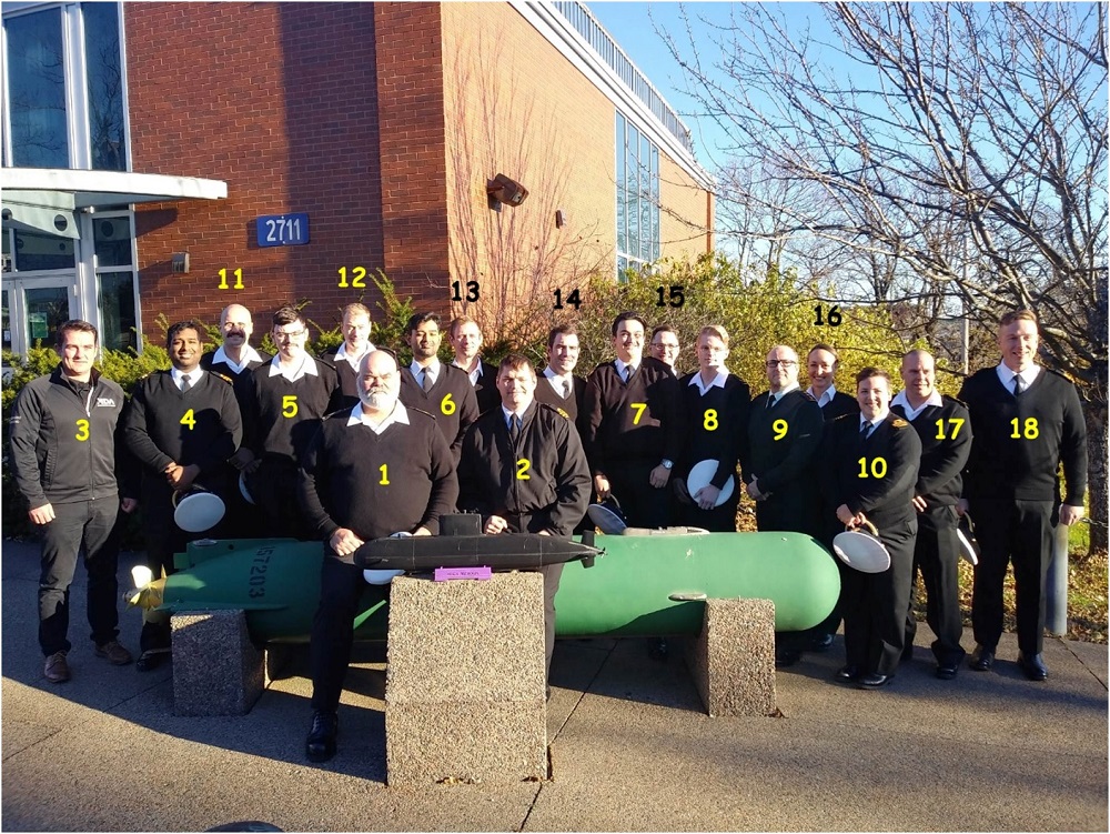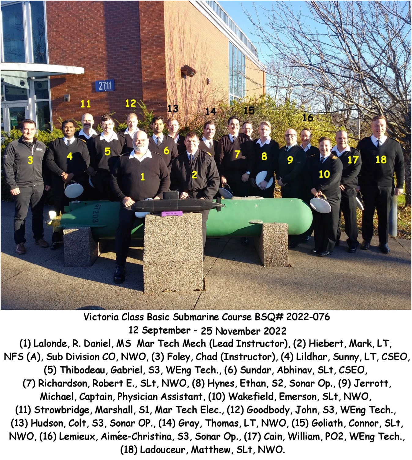 (1) Lalonde, R. Daniel, MS Mar Tech (Lead Instructor), (2) Hiebert, Mark, LT. NFS (A), Sub Division CO, NOW, (3) Foley, Chad (Instructor), (4) Lildhar, Sunny, LT. CSEO, (5) Thibodeau, Gabriel, S3, WEng Tech., (6) Sundar, Abhinav, SLt, CSEO, (7) Richardson, Robert E., SLt, NWO, (8) Hynes, Ethan, S2, Sonar Op., (9) Jerrott, Michael, Captain, Physician Assistant, (10) Wakefield, Emerson, SLt, NWO (11) Strowbridge, Marshall, S1, Mar Tech Elec., (12) Goodbody, John, S3, WEng Tech., (13) Hudson, Colt, S3, Sonar Op., (14) Gray, Thomas, LT. NOW, (15) Goliath, Connor, SLt, NWO, (16) Lemieux, Aimee-Christina, S3, Sonar Op., (17) Cain, William, PO2, WEng Tech, (18) Ladouceur, Matthew, SLt, NWO.