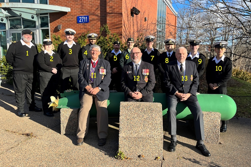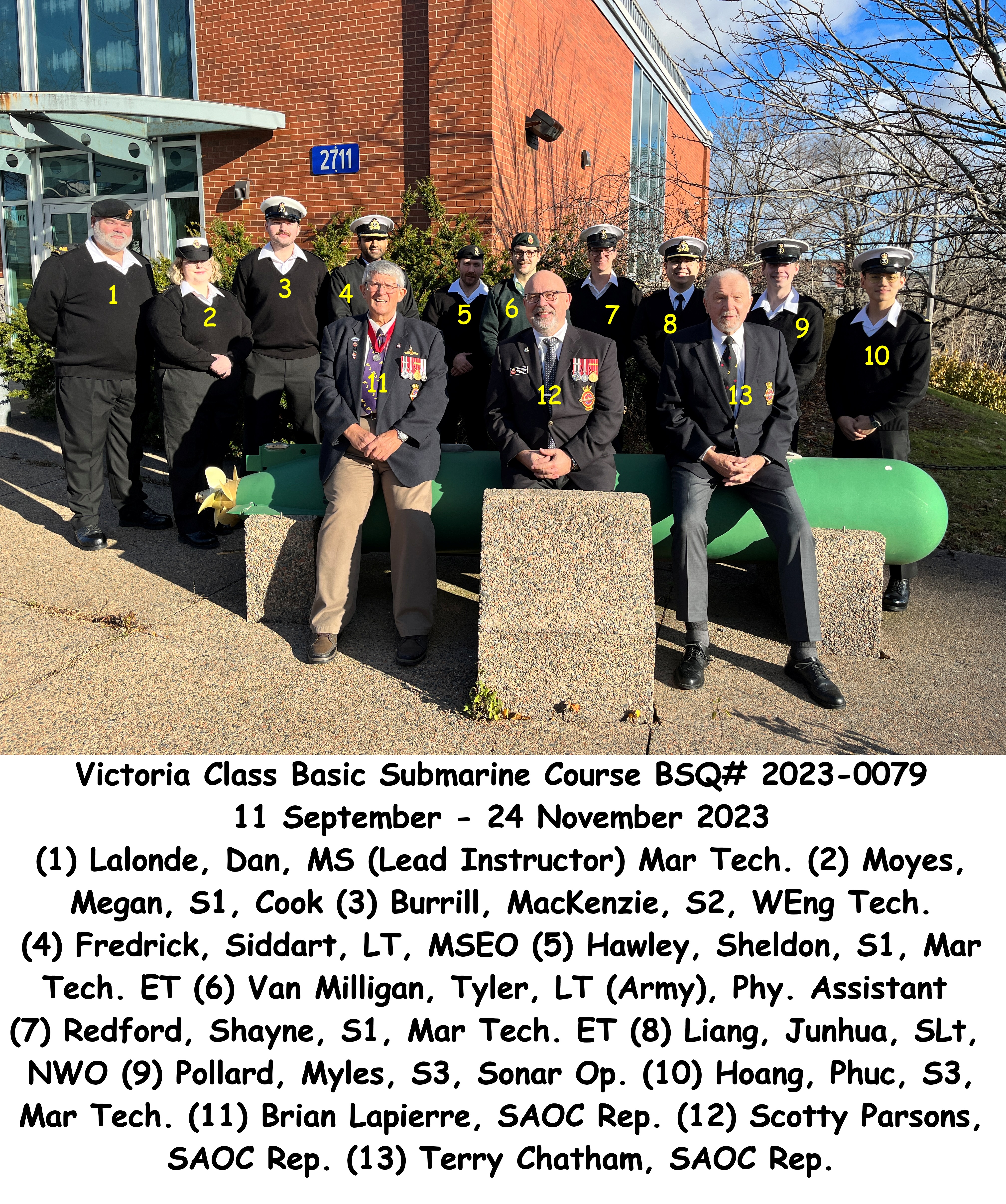 (1) Lalonde, Dan, MS (Lead Instructor) Mar Tech (2) Moyes, Megan, S1, Cook (3) Burrill, MacKenzie, S2, WEng Tech (4) Fredrick, Siddart, LT, MSEO (5) Hawley, Sheldon, S1, Mar Tech. ET (6) Van Milligan, Tyler, LT (Army), Physician Assistant (7) Redford, Shayne, S1, Mar Tech. ET (8) Liang, Junhua, SLt, NWO (9) Pollard, Myles, S3, Sonar Op. (10) Hoang, Phuc, S3, Mar Tech. (11) Lapierre, Brian,SAOC Rep. (12) Parsons, Scotty,SAOC Rep. (13) Chatham, Terry,SAOC Rep.