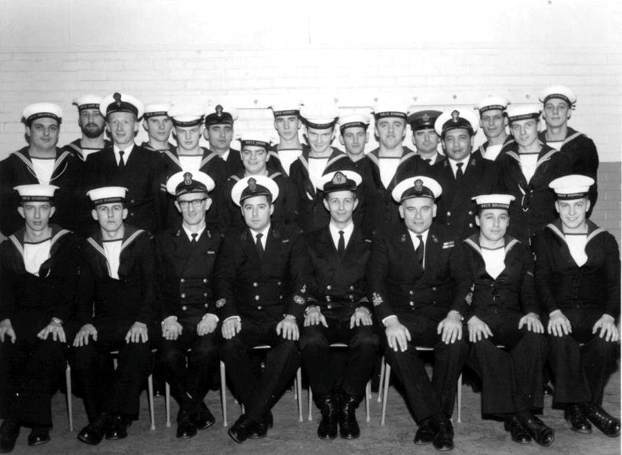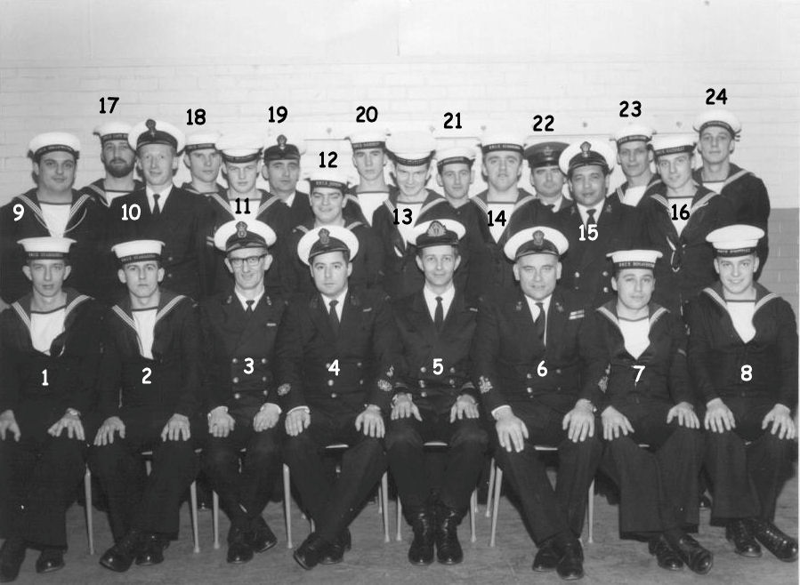 (1) Pindera, Ed, AB (2) White Lloyd, AB (3) Kramer, Frank, CPO2 (Instructor) (4) Hardy, Don, CPO2 (Instructor) (5) Temple, Joe, LCdr (Course Officer) (6) Hawkins, Justice, CPO1 (Instructor) (7) Hawkins, Dave, LS (8) Rowe, Fred, AB (9) Irvine, Barry, LS (10) Klashinsky, Bernie, PO1 (11) Butcher, Gordon, AB (12) Stevens, Donald, LS (13) Mowat, Robert, AB (14) Schneider, Larry, AB (15) Belisle, Alphonse, (PO1) (16) Llewellyn, John, LS (17) Goldsmith, Al, LS (18) Bremner, Dennis, AB (19) Barr, Fenwick, PO1 (20) Claxton, C.J., AB (21) Tremblay, J., AB (22) Gallant, John, Cpl (23) Grady, William, LS (24) Post, Johan, AB