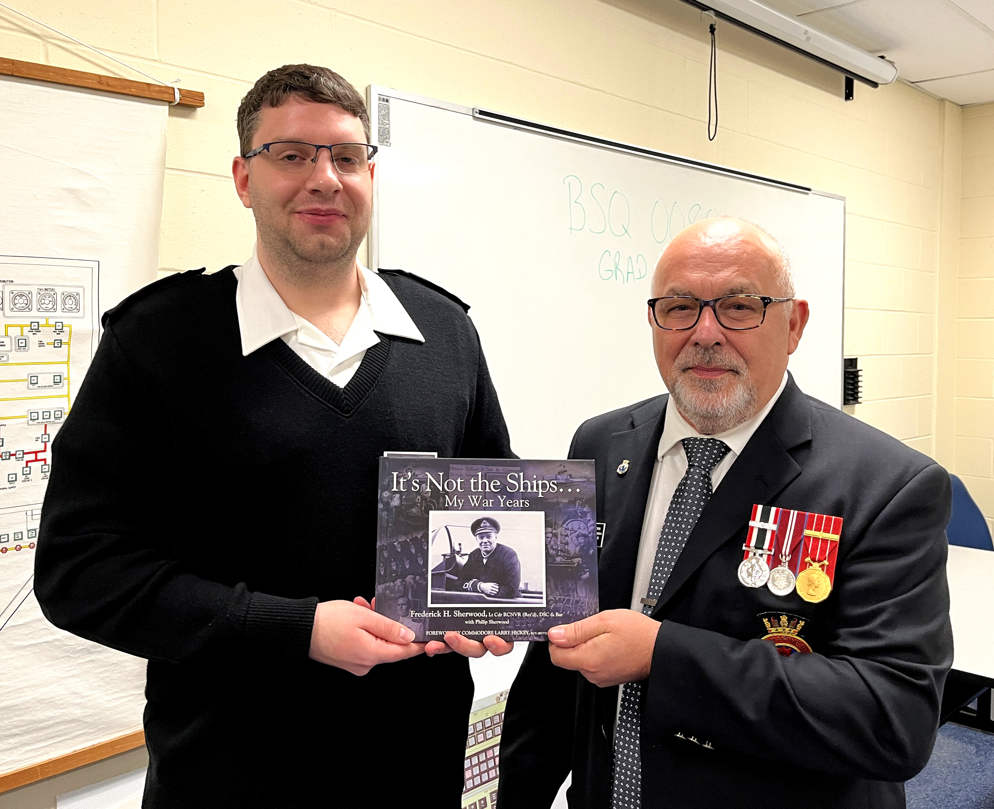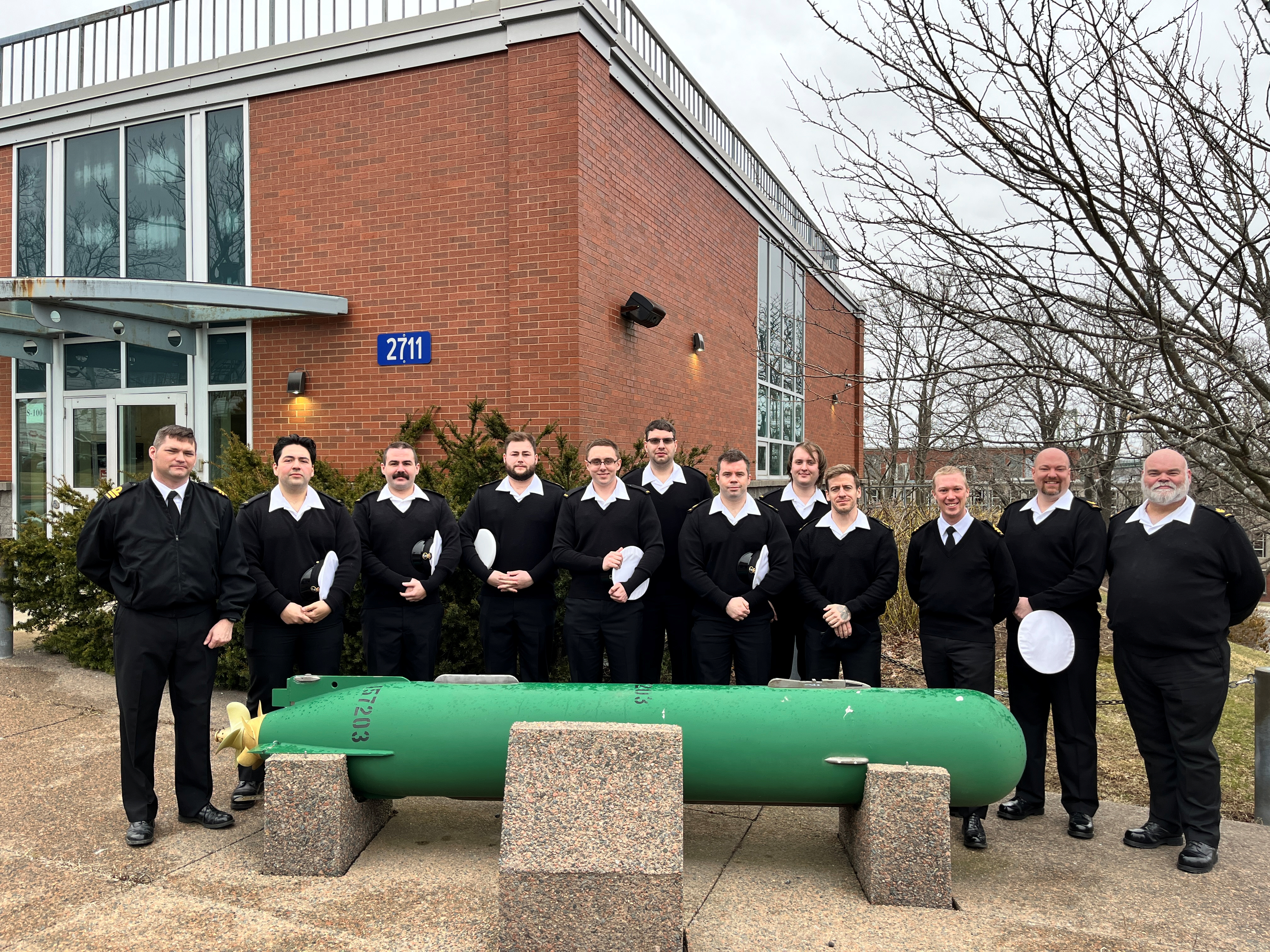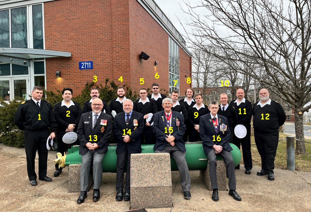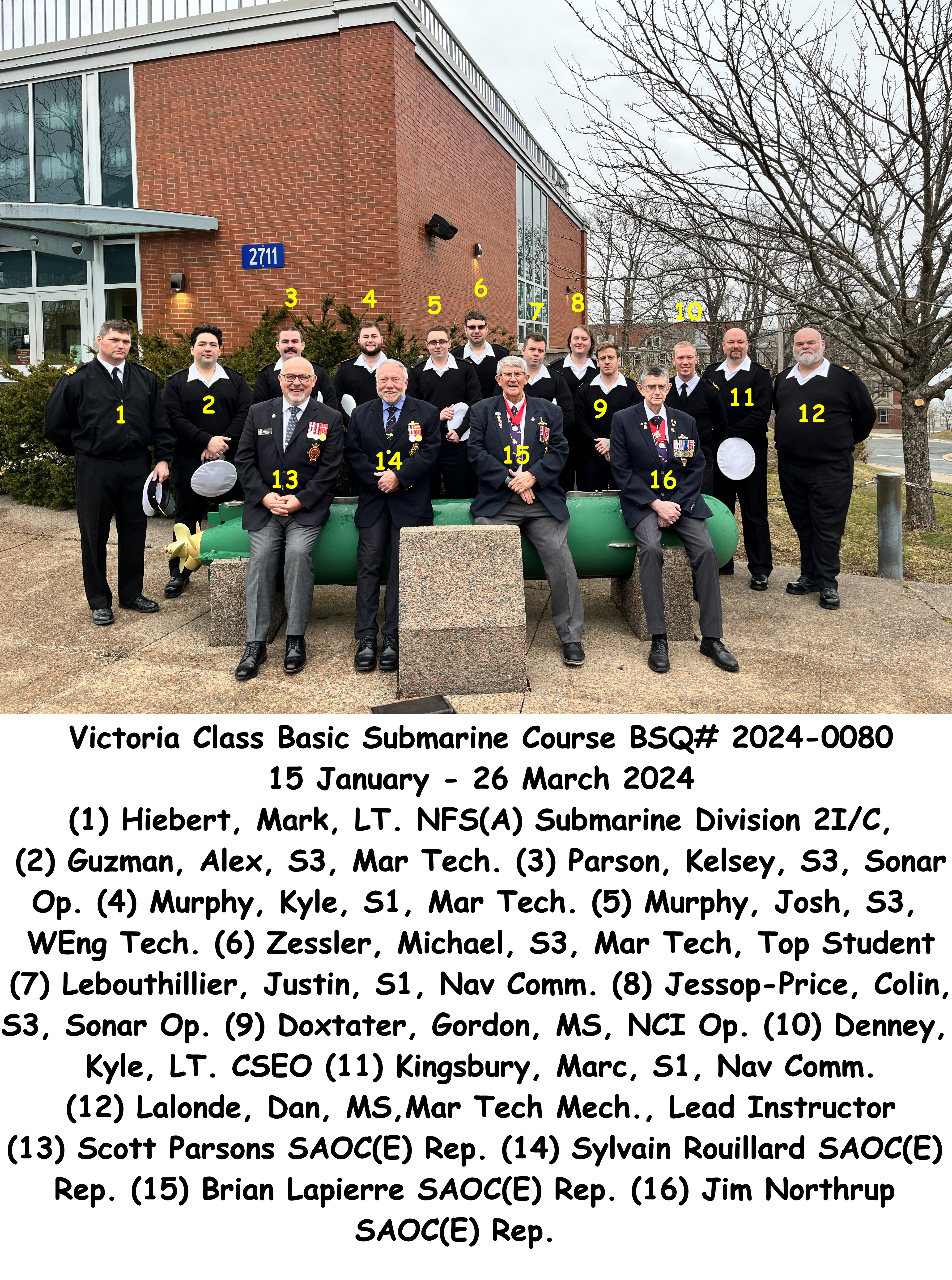 (1) Hiebert, Mark, Lt, NFS(A) Submarine Division 2 I/C (2) Guzman, Alex, S3, Mar Tech (3) Parson, Kelsey, S3, Sonar Op. (4) Murphy, Kyle, S1, Mar Tech (5) Murphy, Josh, S3, WEng Tech (6) Zessler, Michael, S3, Mar Tech, Top Student (7) Lebouthillier, Justin, S1, Nav Comm (8) Jessop-Price, Colin, S3, Sonar Op. (9) Doxtater, Gordon, MS, NCI Op (10) Denney, Kyle, Lt, CSEO (11) Kingsbury, Marc, S1, Nav Comm (12) Lalonde, Dan, MS, Mar Tech Mech, Lead Instructor (13) Scott Parsons, SAOC(E) Rep (14) Sylvain Rouillard, SAOC(E) Rep (15) Brian Lapierre, SAOC(E) Rep (16) Jim Northrup, SAOC(E) Rep