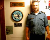 engine covers (3) PO2 Karl Melchoir stands beside the badge that is