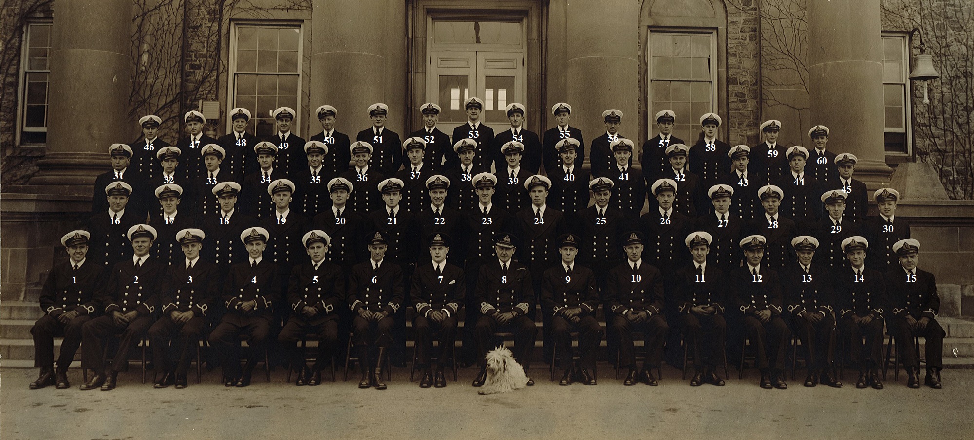 (1) Jennings, W.B. (2) Stewart, L.D. (3) Rice, E.S. (4) Eakins, J.E. (5) Russell, N.J. (6) Birtwistle, L., Lt, Gunnery Officer (7) Nixon, C.P., LCdr, RCN, XO (8) Hope, A.M., Capt, RCN, CO (9) Glass, C.L.O., SLt (10) Ross, C.A., SLt (11) Ross, A.W. (12) Tarleton, G.W. (13) Brown, G.K. (14) Jenke, G.M. (15) Campbell, J.C.