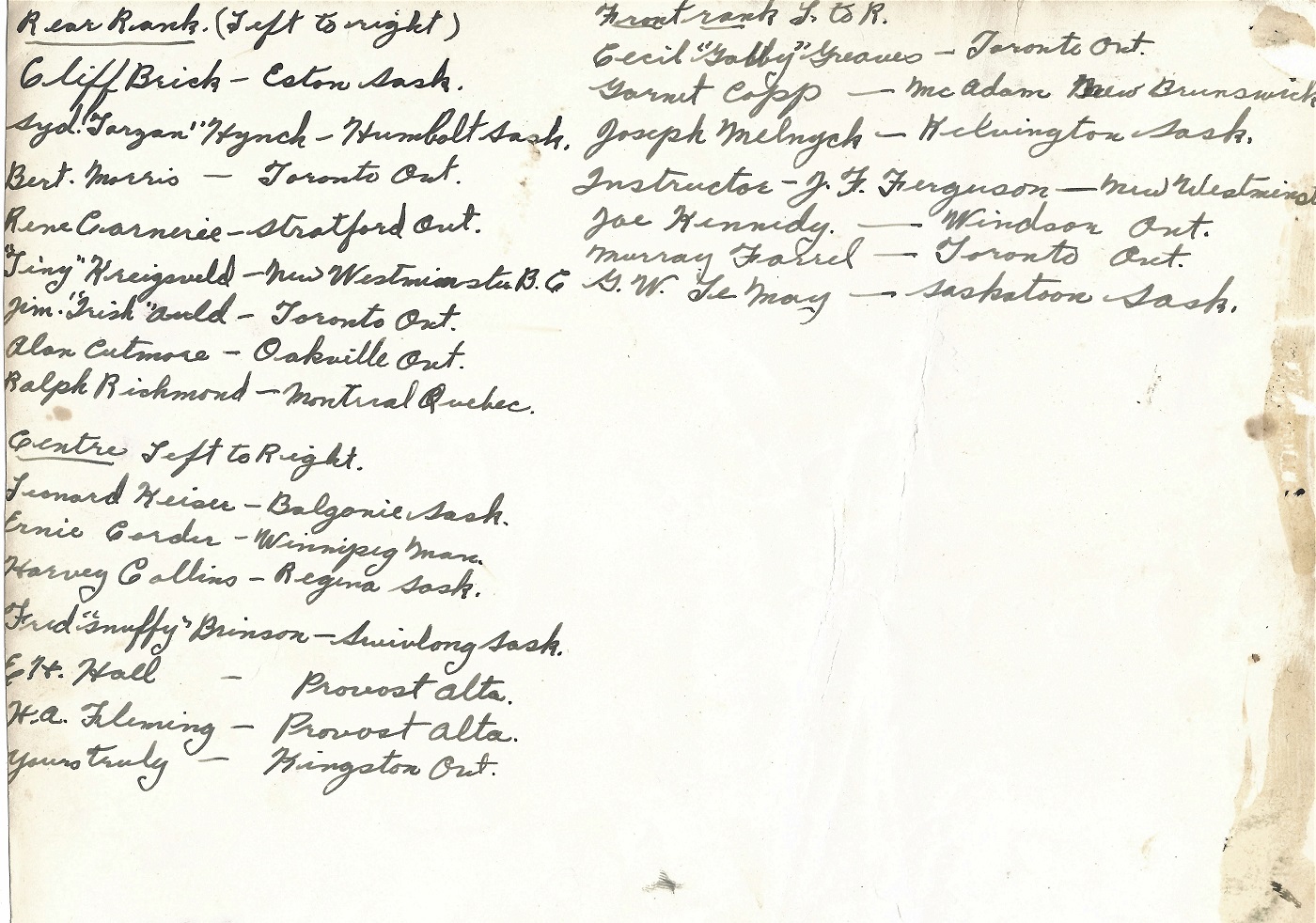 (1) Greaves, Cecil (Gobby) (2) Copp, Gormet (3) Melnych, Joseph (4) Ferguson, J.F. (Instructor) (5) Kennedy, Joe (6) Farrel, Murray (7) LeMay, G.W. (8) Keiser, Leonard (9) Corder, Ernie (10) Collins, Harvey (11) Brnson, Fred (Snuffy) (12) Hall, ?.H (13) Fleming, H.A. (14) Hare, Leonard (15) Brick, Cliff (16) Hynch, Syd (Tarzan) (17) Morris, Bert (18) Carnerie, Rene (19) Kreigaveld, (Tiny) (20) Ault, Jim (Irish) (21) Cutmore, Alan (22) Richmond, Ralph