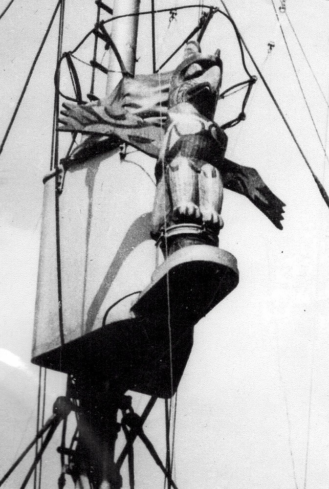 In 1942, the corvette HMCS QUESNEL was in a storm off the Queen Charlotte Islands in the Hecate Strait. The CO took the ship into the shelter of Alert Bay, where, while there, a few crew went ashore. When they returned, they had a Thunderbird totem pole which they had "acquired" from a local cemetery. The Thunderbird was in rough shape, worm-holed and the wings were missing. The ships engineers made new wings and repaired and painted the Thunderbird to the best of their abilities and it was attached to HMCS QUESNEL'S mast where it remained until the end of the war. In 1945, HMCS QUESNEL was paid off at Sorel, Quebec and the Thunderbird disappeared and its whereabouts are unknown.