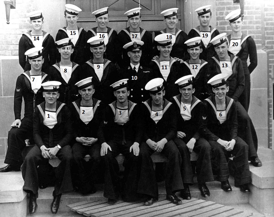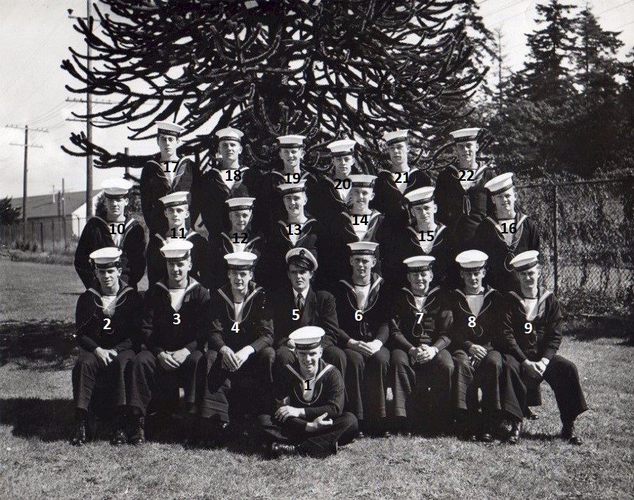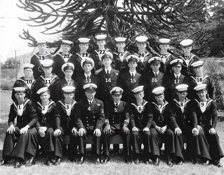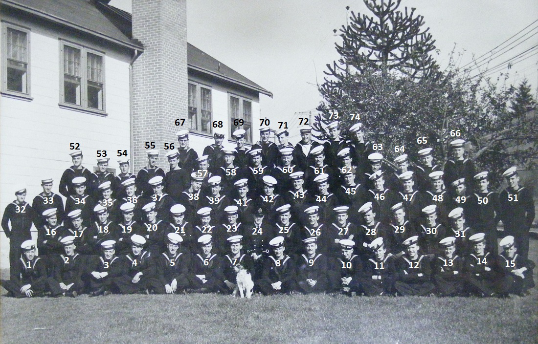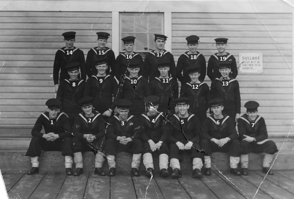 (1) Osypichuk, M. (2) McKenna, J. (3) Gallo, Mike, LS, Instructor (4) Harvey, L.D. (5) Smith, D. (6) Johnson, H.M. (7) Jones, E. (8) Cummings, William (9) Cook, J.D. (10) McReady, T.M. (11) Pound, W.G. (12) Mather, W.G. (13) Barber, G.M. (14) Wallace, J.F. (15) Johnston, B.A. (16) Pierce, J. (17) Strachan, R. (18) Krpan, Ivan John
