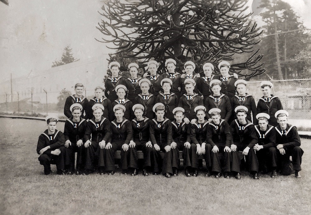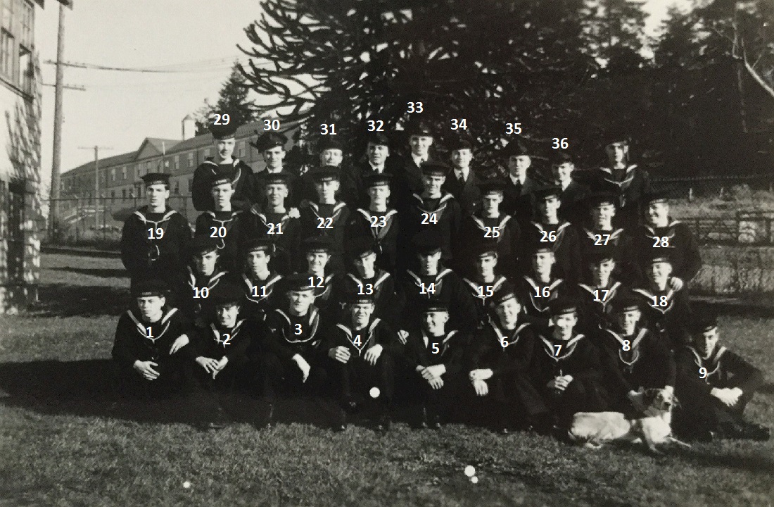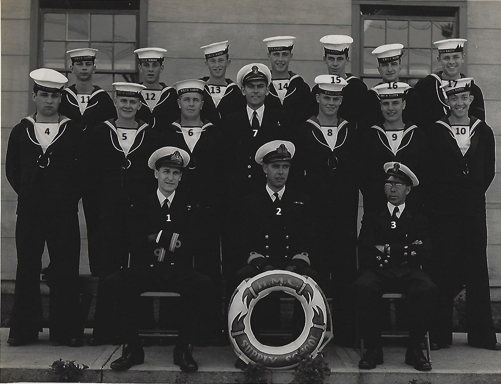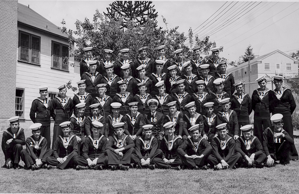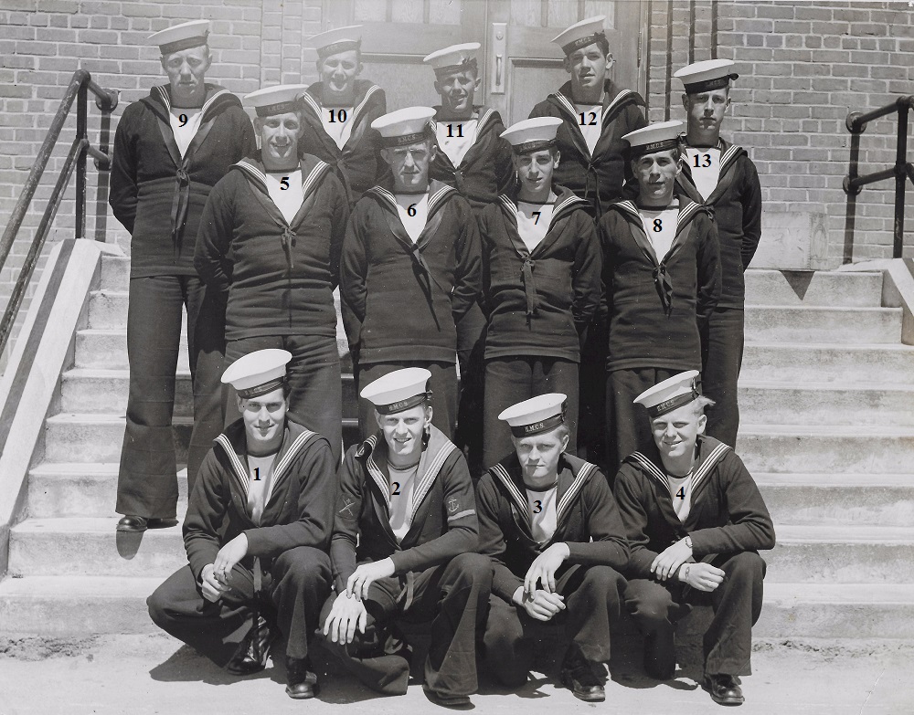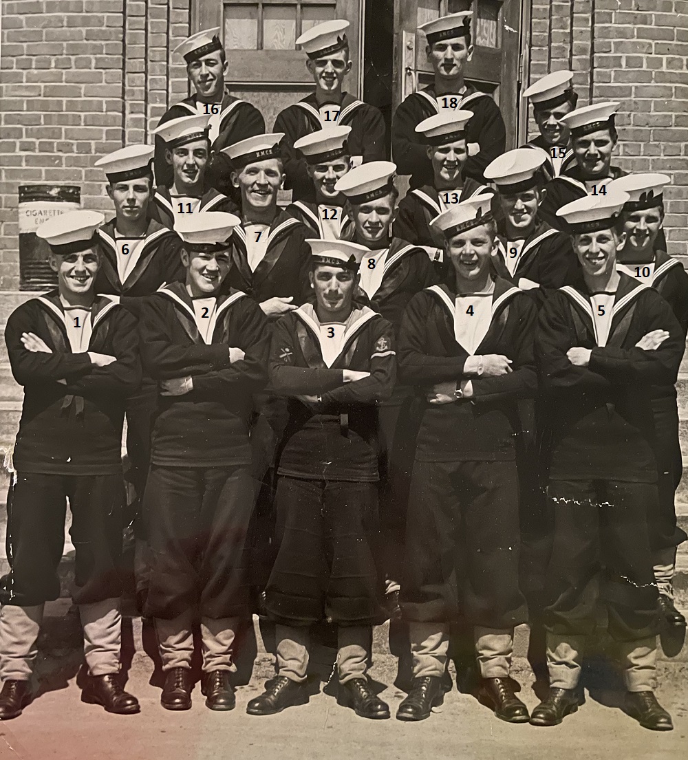 (1) Osypichuk, M. (2) McKenna, J. (3) Gallo, Mike, LS, Instructor (4) Harvey, L.D. (5) Smith, D. (6) Johnson, H.M. (7) Jones, E. (8) Cummings, William (9) Cook, J.D. (10) McReady, T.M. (11) Pound, W.G. (12) Mather, W.G. (13) Barber, G.M. (14) Wallace, J.F. (15) Johnston, B.A. (16) Pierce, J. (17) Strachan, R. (18) Krpan, Ivan John