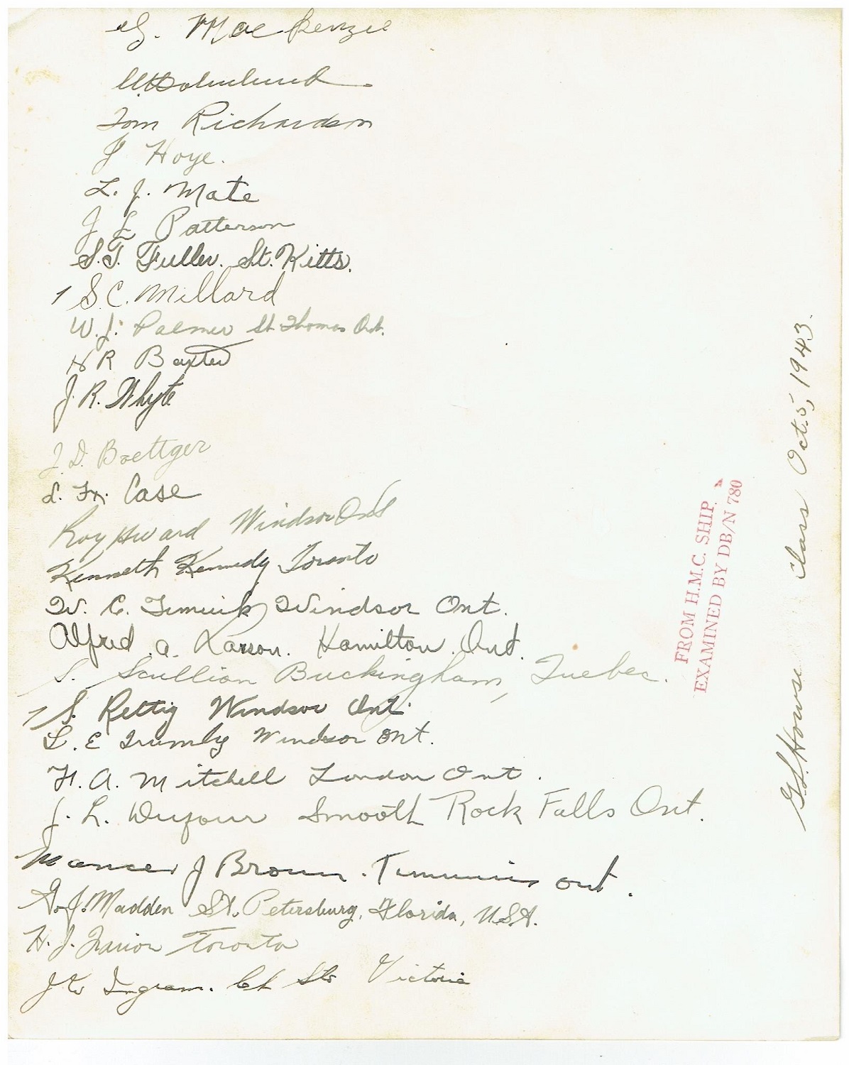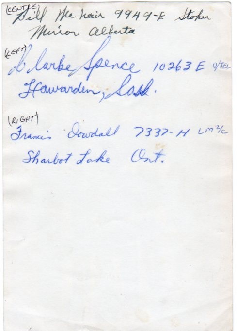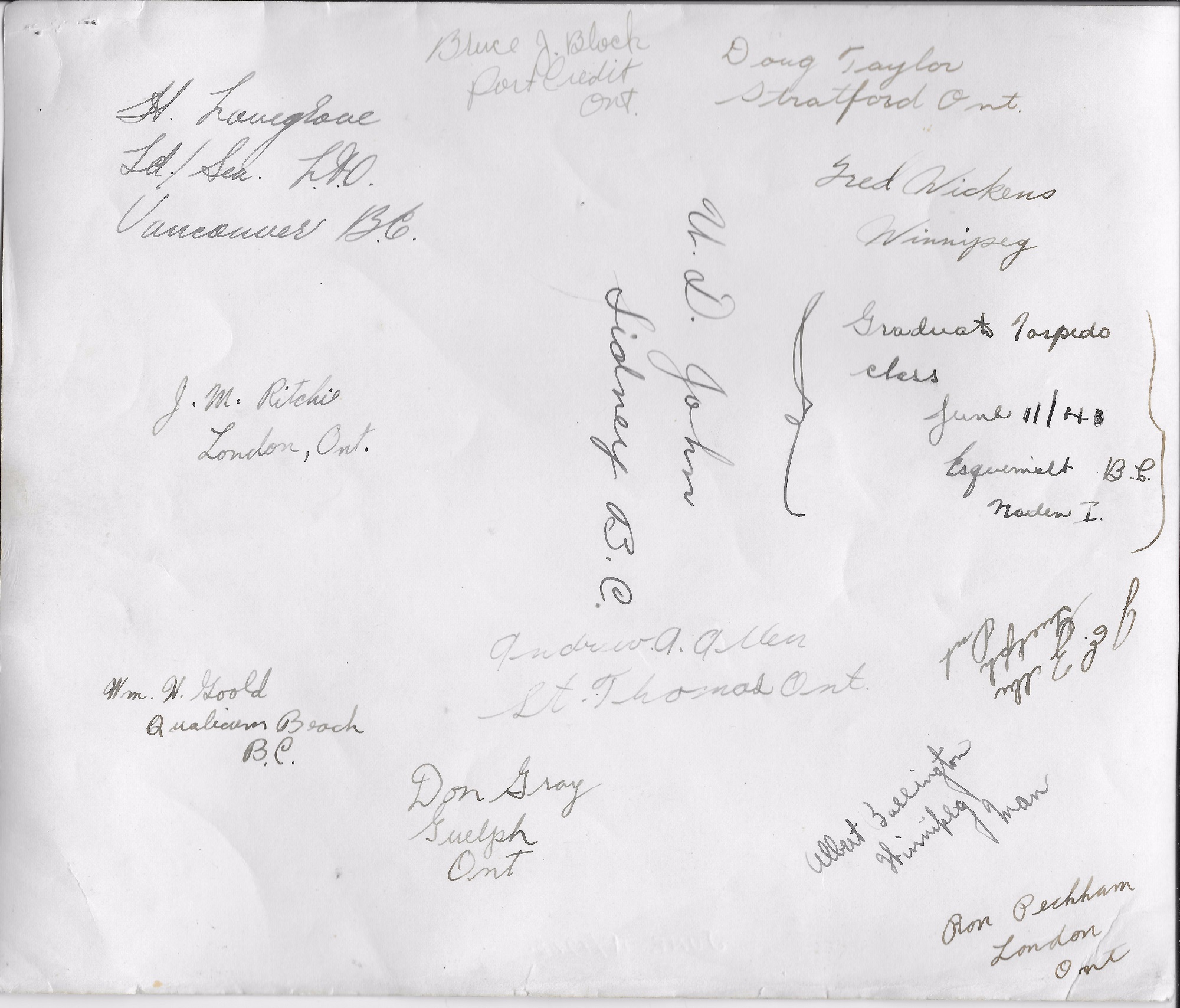 signatures: H. Lovegrove Ld/Sea LTO Vancouver BC; J.M. Ritchie, London, Ont.; Wm. H. Goold, Qualicum Beach B.C.; Don Gray, Guelph Ont; Bruce J. Block, Port Credit Ont.; U.D. John, Sidney B.C.; Andrew A. Allen, St. Thomas Ont.; Doug Taylor, Stratford, Ont.; Fred Wickens, Winnipeg; J.E. Zeller, Guelph Ont.; Albert Bussington, Winnipeg Man; Ron Peckham, London Ont" //Wm. (Billy/Bill) H. McComb