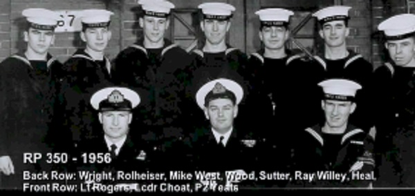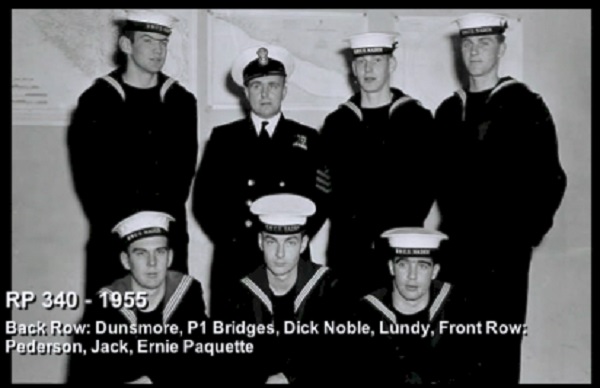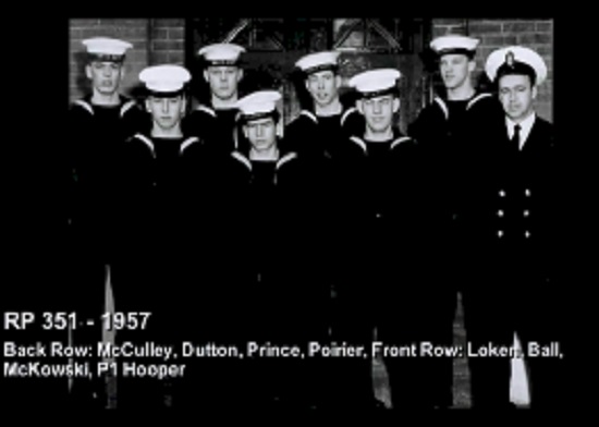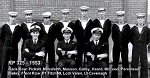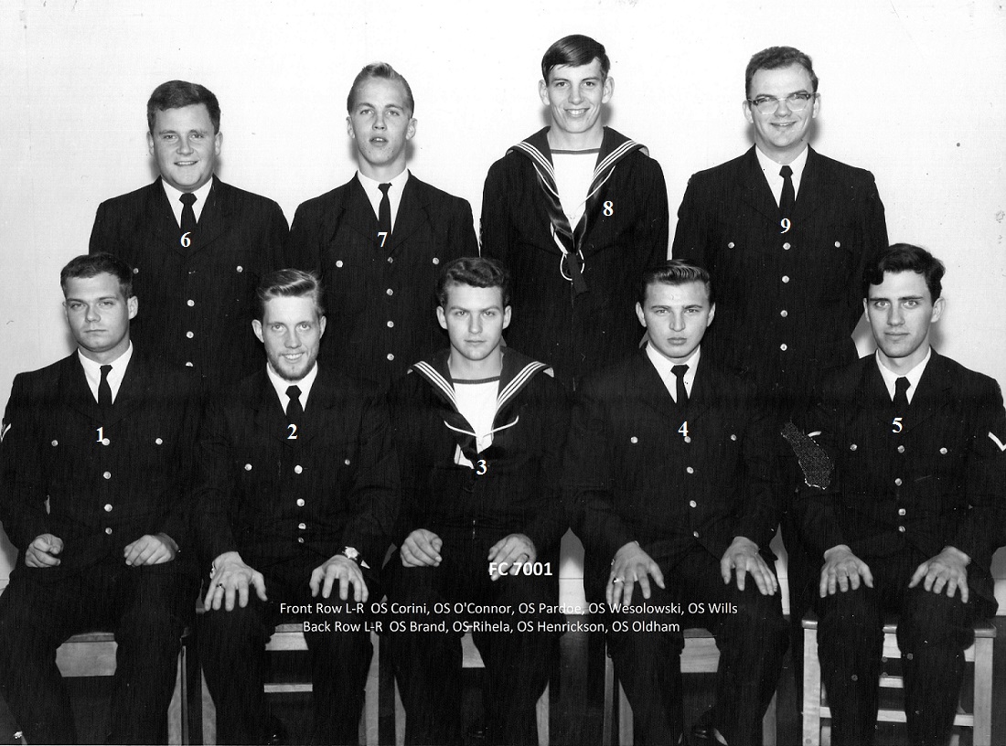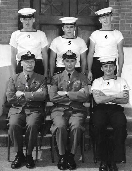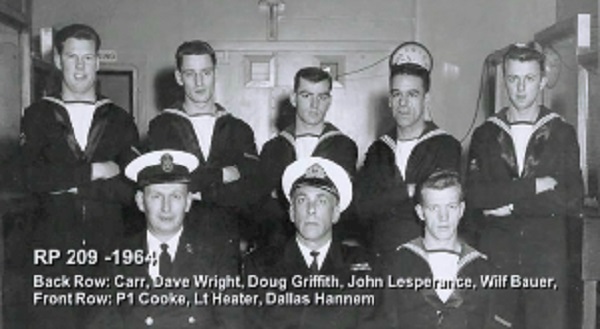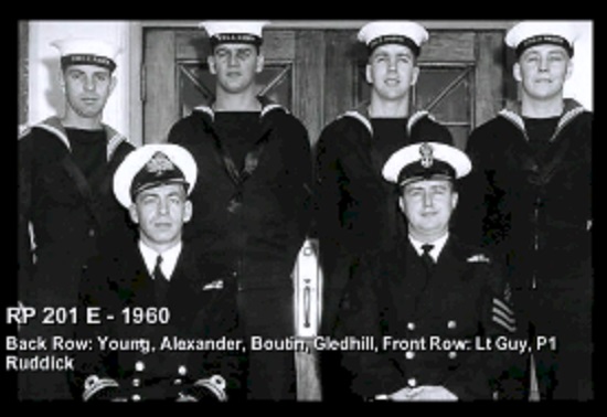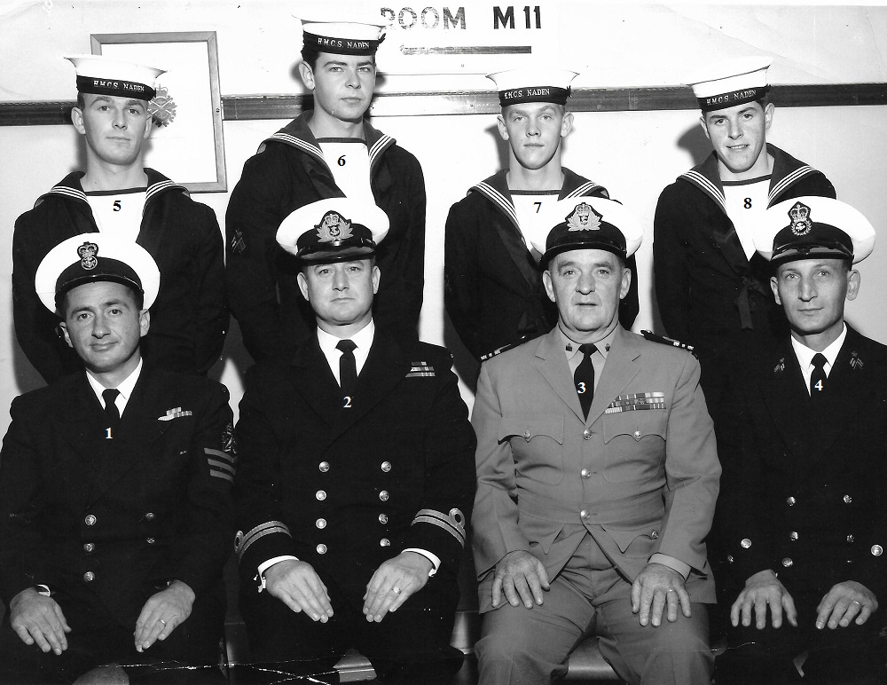 (1) Theriault, Bob, PO1 (2) Rowley, Al, Lt (3) Bonner, Al, LCdr (4) Drummond, C2 (5) Holman (6) Leach (7) Featherby (8) Rivest (missing Wiege)