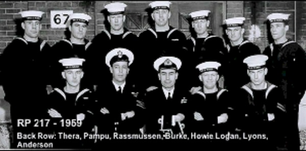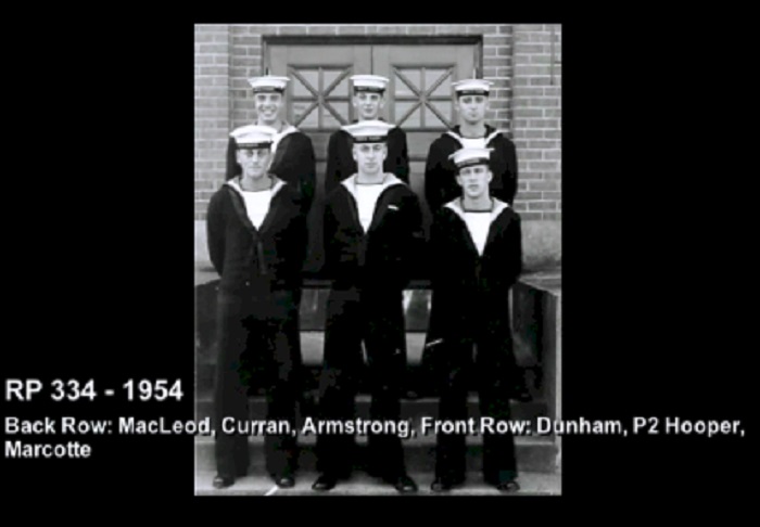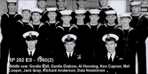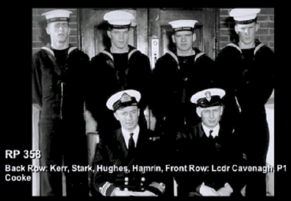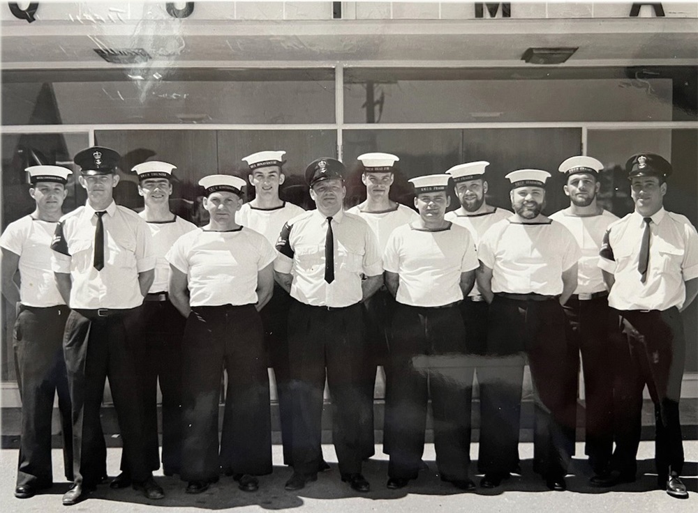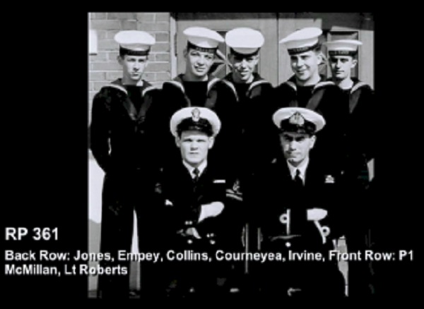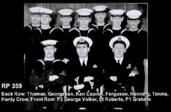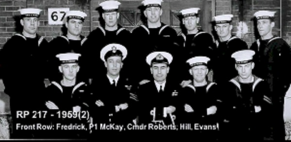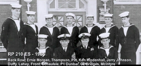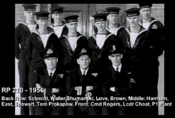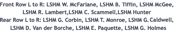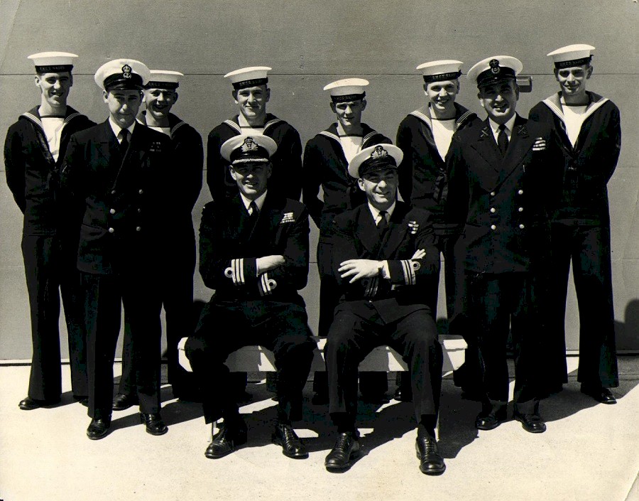 (1) Theriault, Bob, PO1 (2) Rowley, Al, Lt (3) Bonner, Al, LCdr (4) Drummond, C2 (5) Holman (6) Leach (7) Featherby (8) Rivest (missing Wiege)