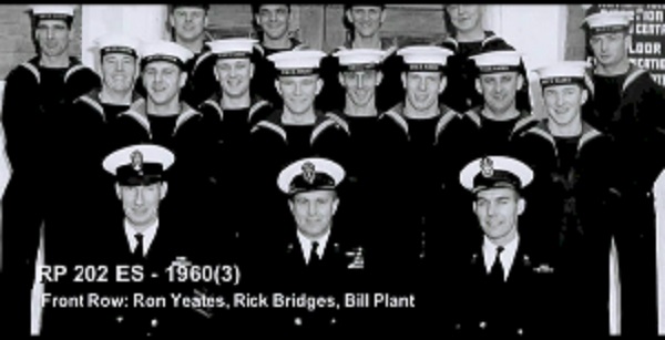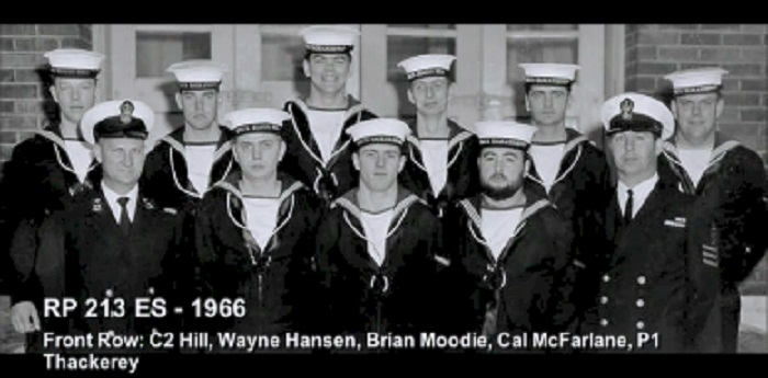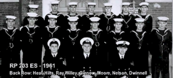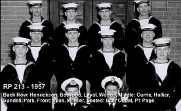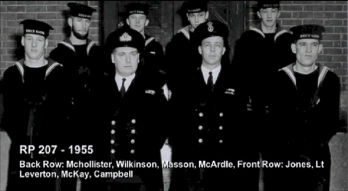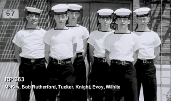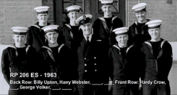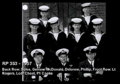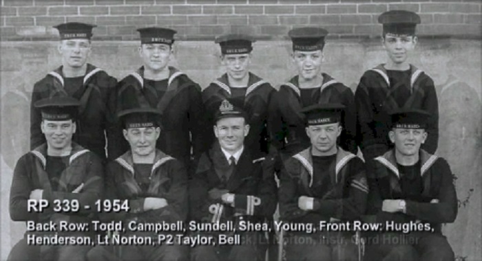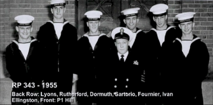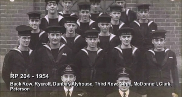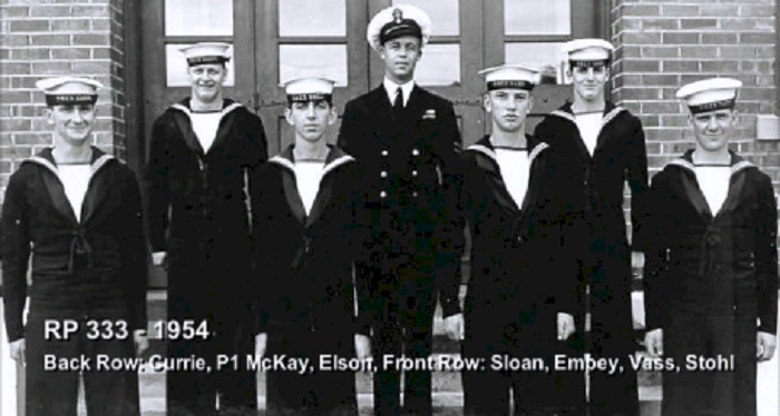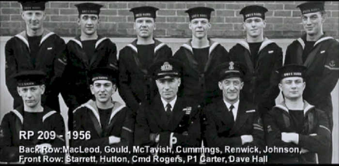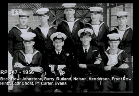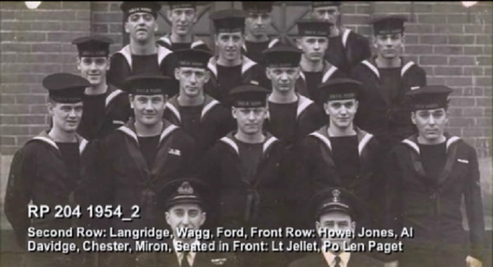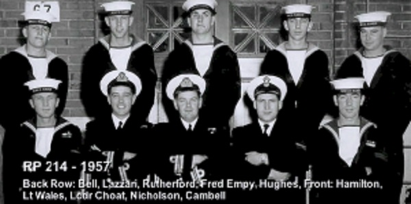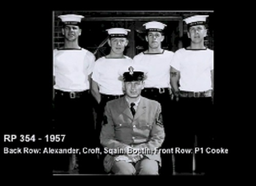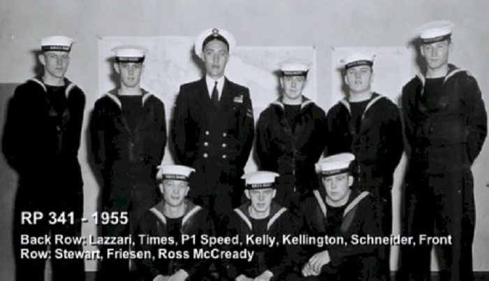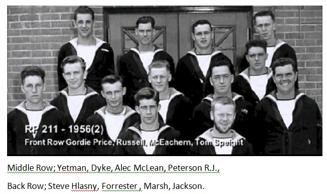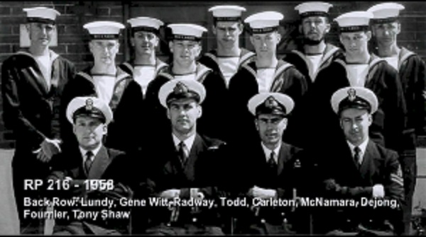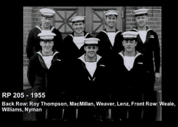 TAS3 Course - 1954 HMCS NADEN Front: L-R: Frank Waters, Unknown, Unknon Rear L-R: Ken Wardell , Phillip Thomas, PO1 Dickson (Buddy), Carl Kniert, Rattan Courtesy of Steve Hlasny