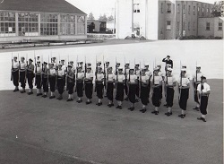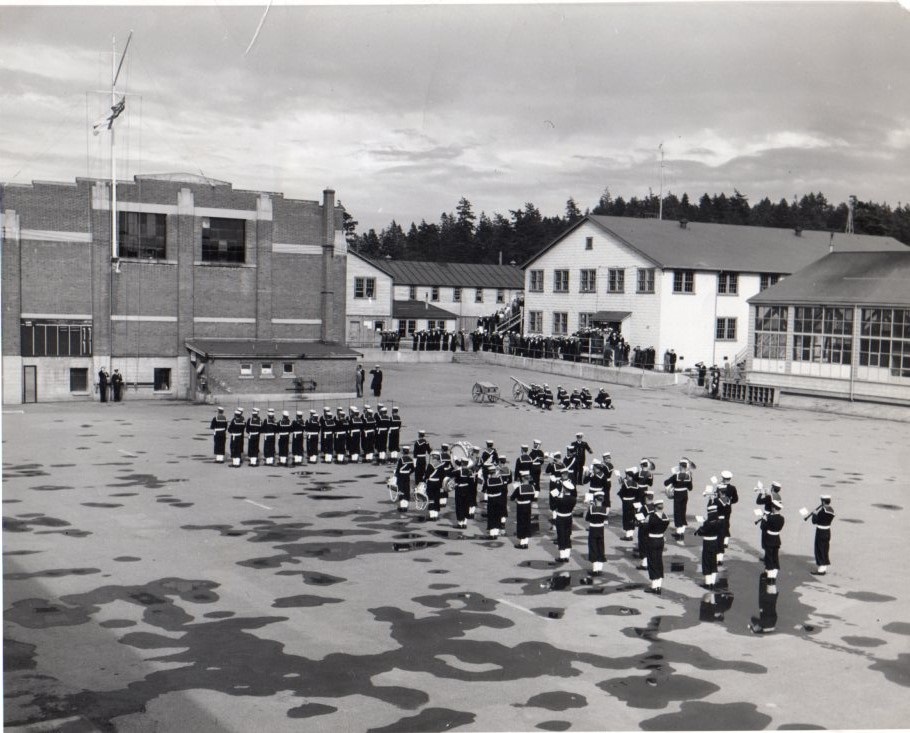 (1) Three members of New Entry 12 Class, HMCS NADEN, 1948 - L-R: Clarke Spence, 10263-E, O/Tel from Hawarden, SK; Bill McNair, 9949-E, Stoker from Mirro, AB; Francis Dowdall, 7337-H, LM2c from Sharbot Lake, ON (2) New Entry 12 Class "We were a small class and we were selected to be the Colour Guard and Precision Squad for performances during Navy Week and at the opening of the Provincial Parliament. We spent a lot of time on the parade square." (3) New Entry 12 Class, 1948, dress rehearsal for "Colours" on the parade square, HMCS NADEN