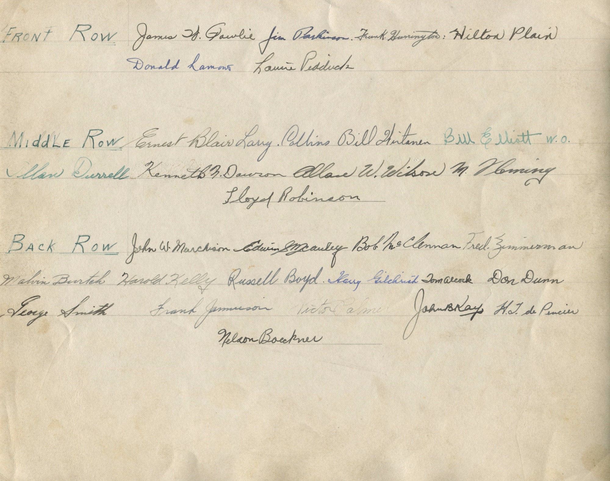 (16) Murchison, John W. (17) Mcauley, Edwin (18) McClennan, Bob (19) Zimmerman, Fred (20) Burteh, Malvin (21) Kelly, Harold (22) Boyd, Russell (23) Alcock, Tom (24) Gilchrist, Harry (25) Dunn, Don (26) Smith, George (27) Jamieson, Frank (28) Palmer, Victor (29) Kay, John B. (30) de Pencier, H.T. (31) Boeckner, Nelson