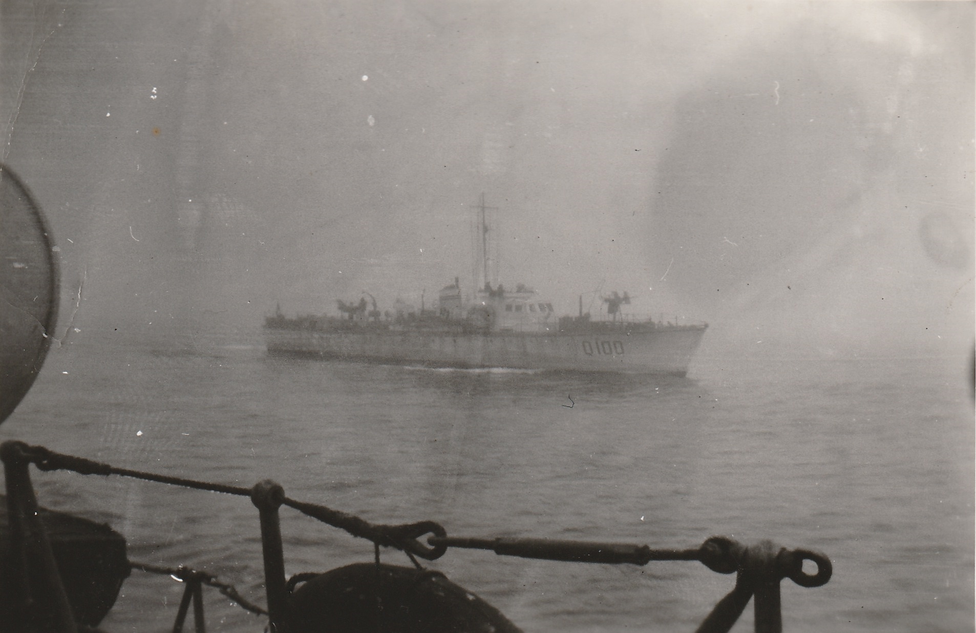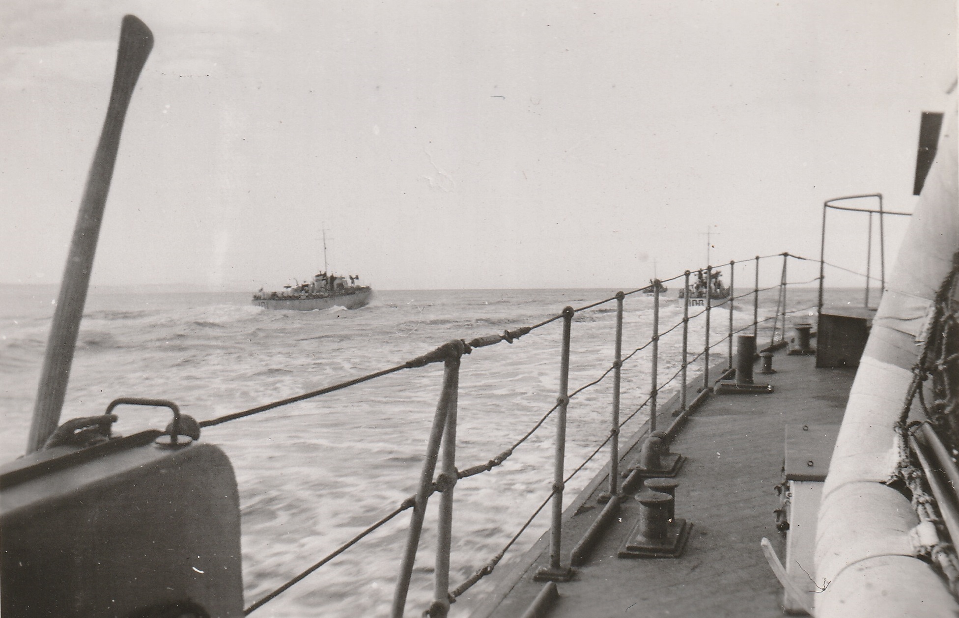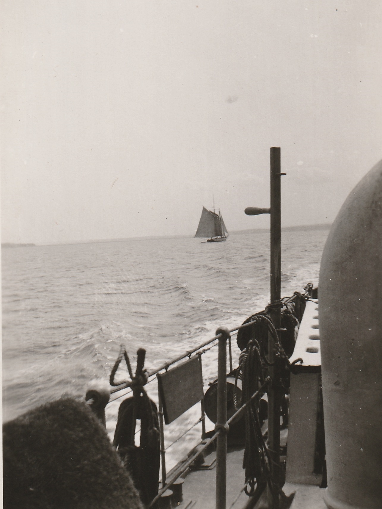 (WL036) ML Q100 seen from unknown Fairmile (W037) ML Q101 (left side of photo), ML Q100 (ahead of Fairmile in foreground), possibly ML Q084 lead ship (WL038) Sailor on the quarterdeck of an unknown Fairmile - with another Fairmile following astern (WL039) Sailing vessel seen from unknown Fairmile
