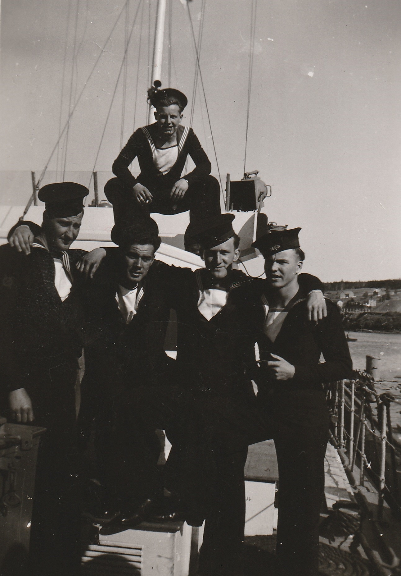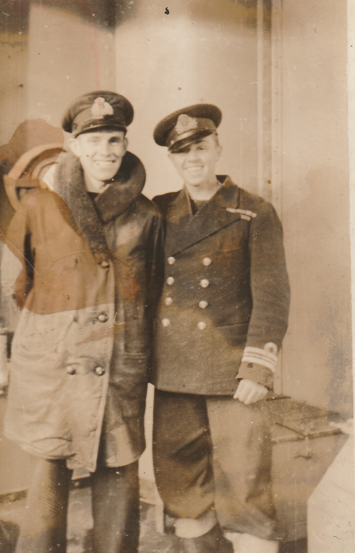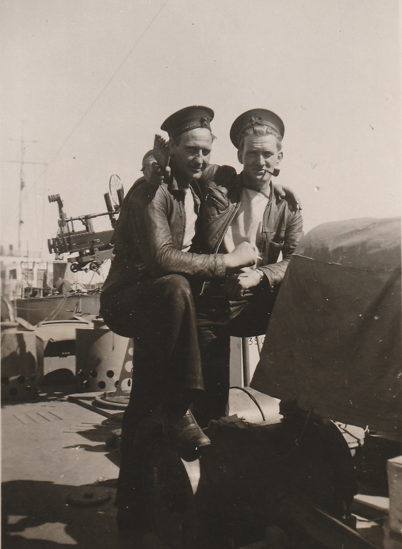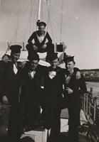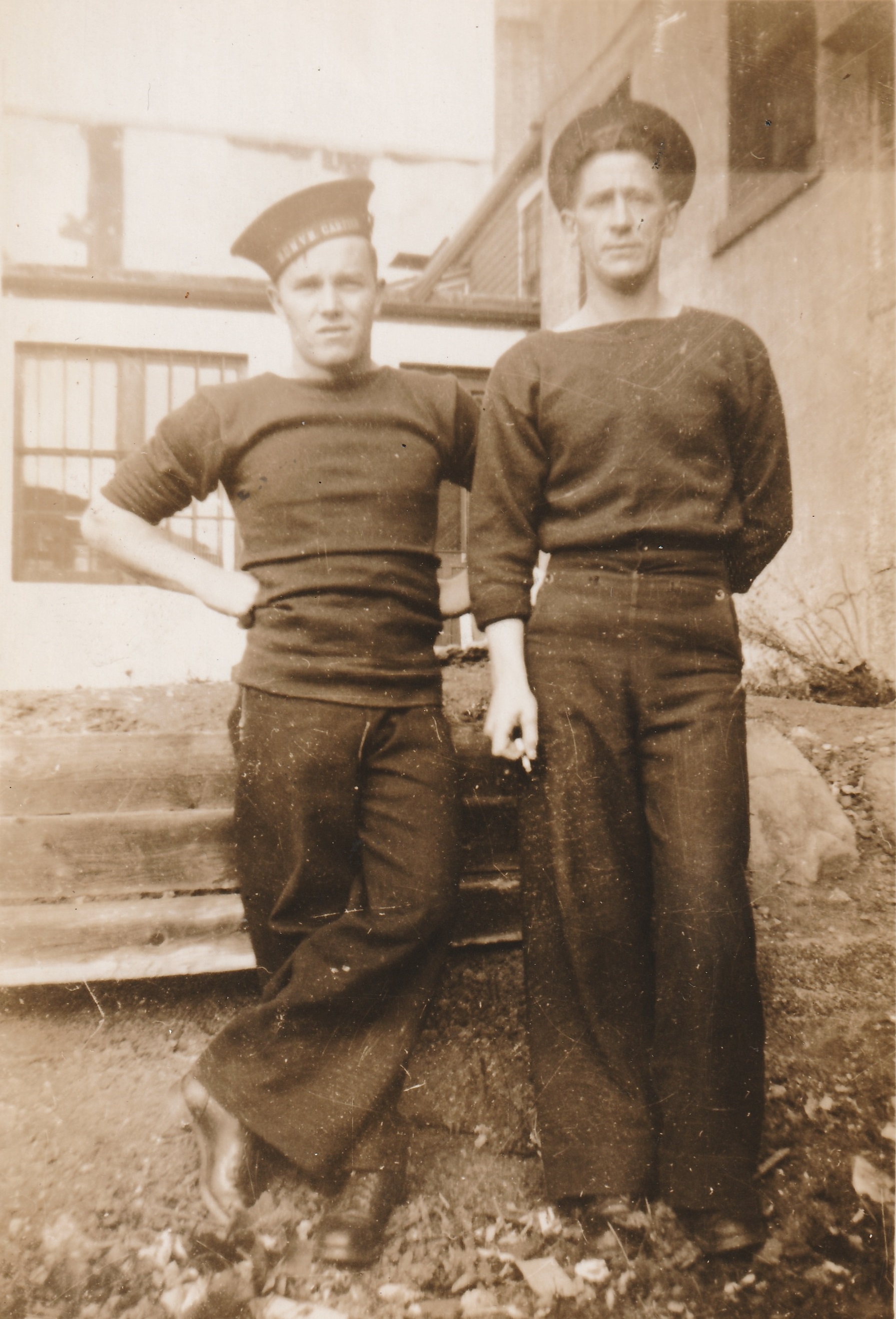 (WL012) Unknown sailors on an unknown warship. Judging by the ill-fitting uniform of the young "officer" on the right, it is Christmas day and he, as the youngest sailor on the ship, swapped places with the Commander Officer and became C.O. for the day. (WL013) Unknown sailors ashore. The cap tally on the sailor on the right shows "RCNVR CAR" with the remaining letters unknown. Possibly Naval Reserve Division CARLETON or CARTIER (WL014) Unknown sailor with HMC MINESWEEPER cap tally (WL015) Unknown sailor with friend
