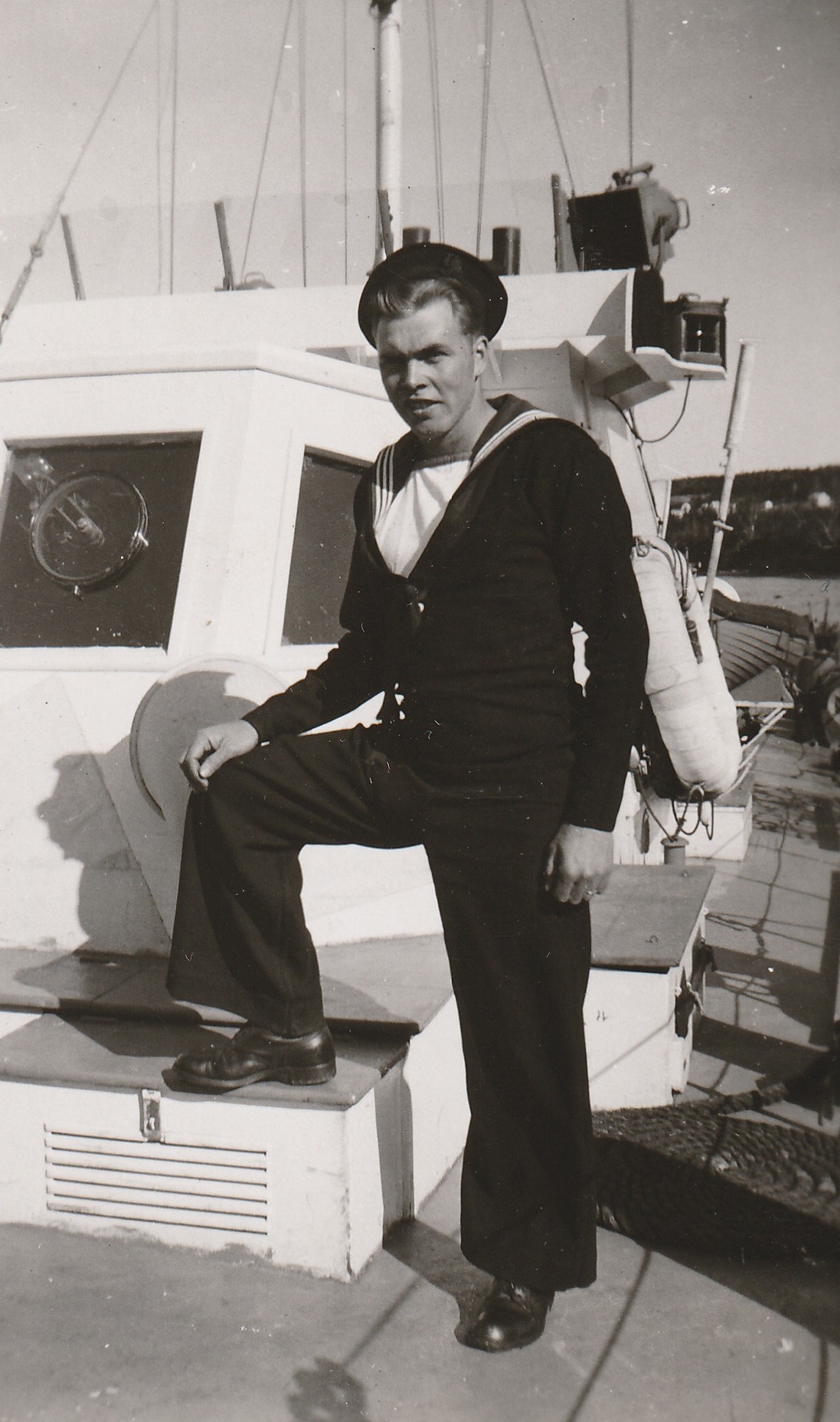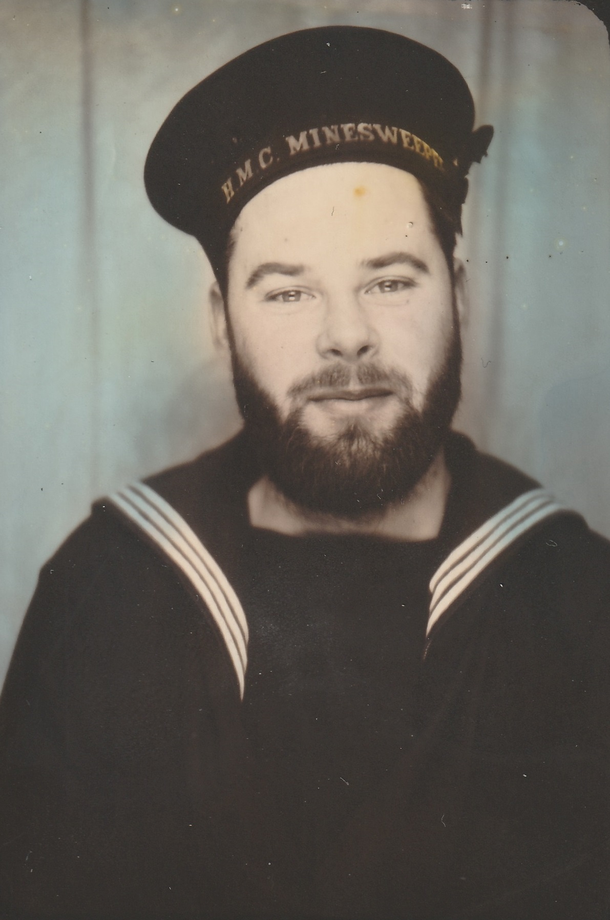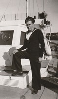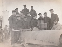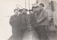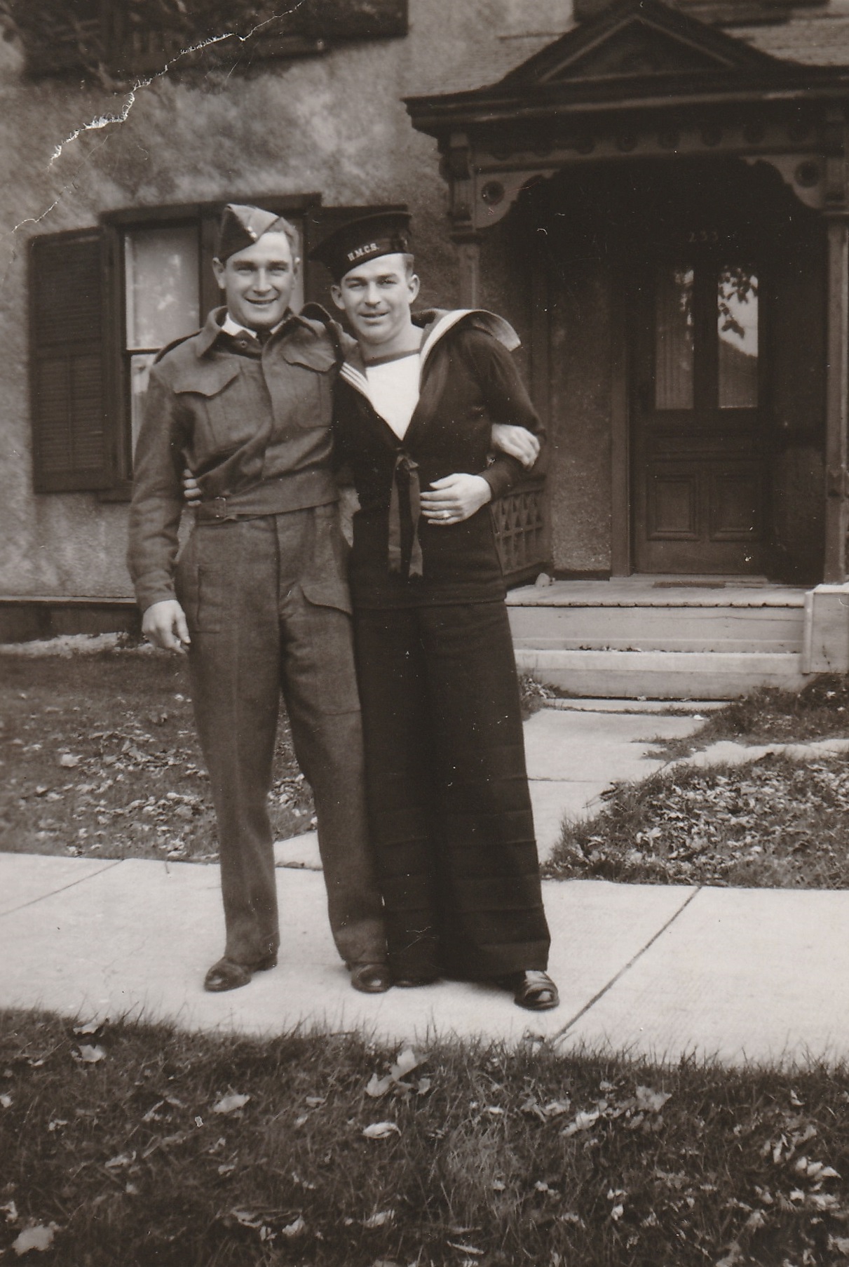 (WL012) Unknown sailors on an unknown warship. Judging by the ill-fitting uniform of the young "officer" on the right, it is Christmas day and he, as the youngest sailor on the ship, swapped places with the Commander Officer and became C.O. for the day. (WL013) Unknown sailors ashore. The cap tally on the sailor on the right shows "RCNVR CAR" with the remaining letters unknown. Possibly Naval Reserve Division CARLETON or CARTIER (WL014) Unknown sailor with HMC MINESWEEPER cap tally (WL015) Unknown sailor with friend