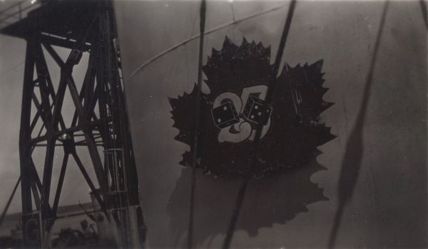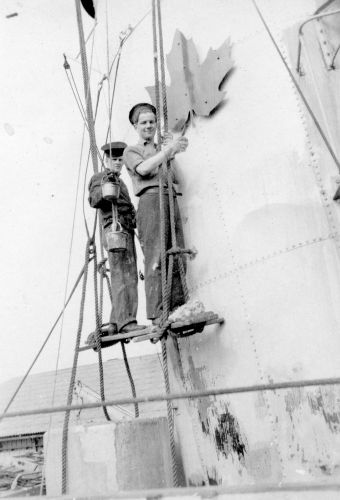 HMCS IROQUOIS' Maple Leaf on her funnel gets a fresh coat of paint in 1944