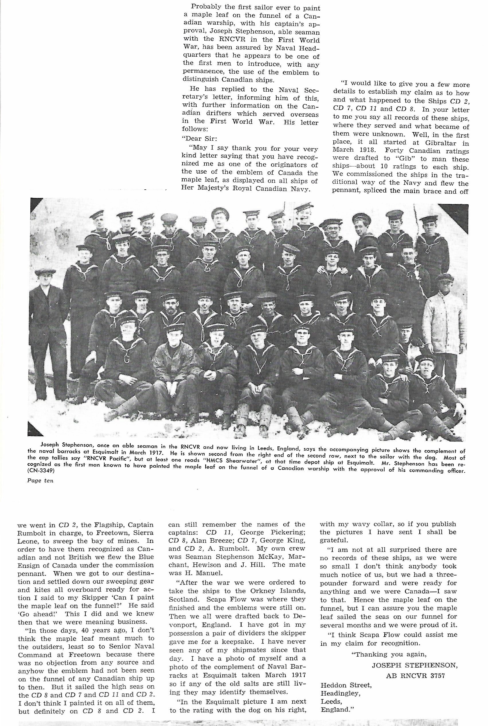 But that's not all to the story ..... two First World War naval veterans of the RNCVR have made claims to being the 1st sailors to paint a maple leaf on the funnel of their ships. They are PO Arthur John Avery Bell, RCNVR who served in CD-75 and AB Joseph Stephenson, RNCVR who served in CD-2