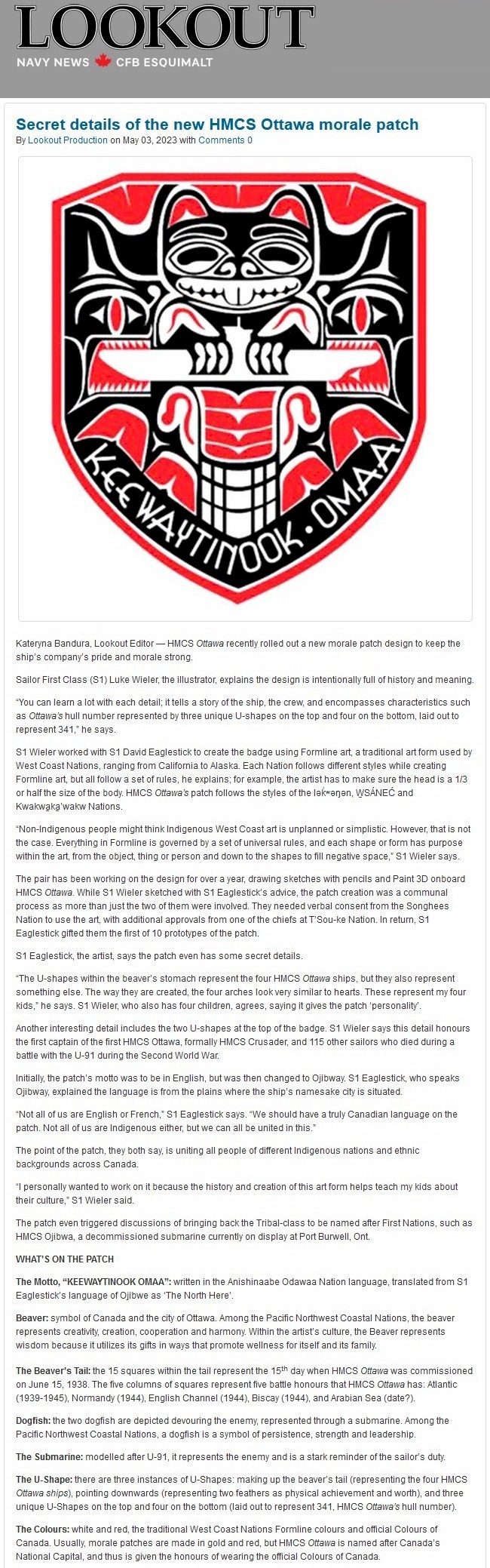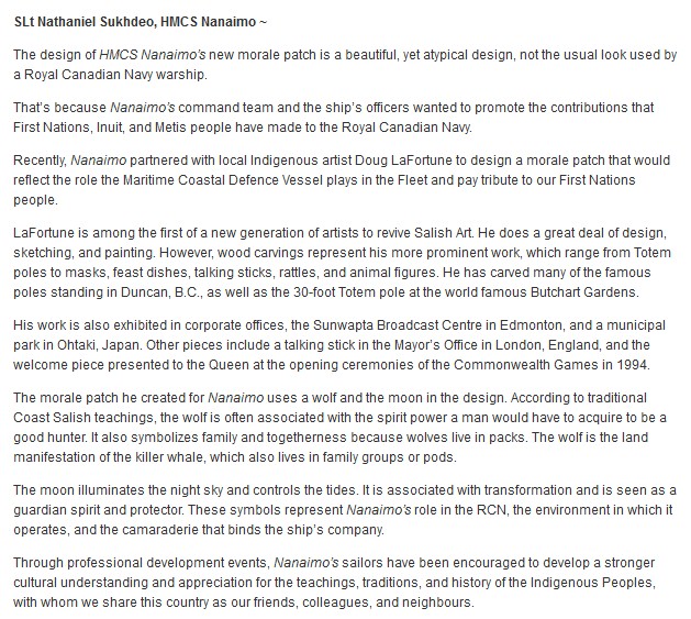 Mission / Morale patches are worn on the right sleeve of the Naval Environment Combat Uniform and the RCN and unit patch is worn on the left sleeve