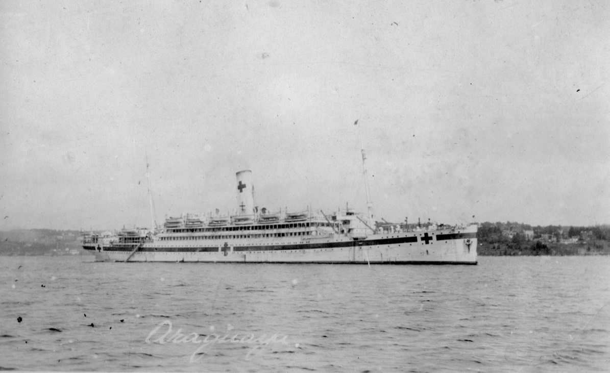 HMHS ARAGUAYA was commissioned as a hospital ship by the British Admiralty on 2 May 1917. She made one trip to Canada, in June 1917, with a Royal Army Medical Corps (RAMC) unit on board. Returning to England she sighted a German submarine north of Ireland. Upon arrival at Liverpool in September 1917, she was transferred to Canadian operational control and the CAMC staff previously on LETITIA took over the hospital. ARAGUAYA made nine voyages as a Canadian hospital ship before her commission was revoked on the recommendation of the British Admiralty.