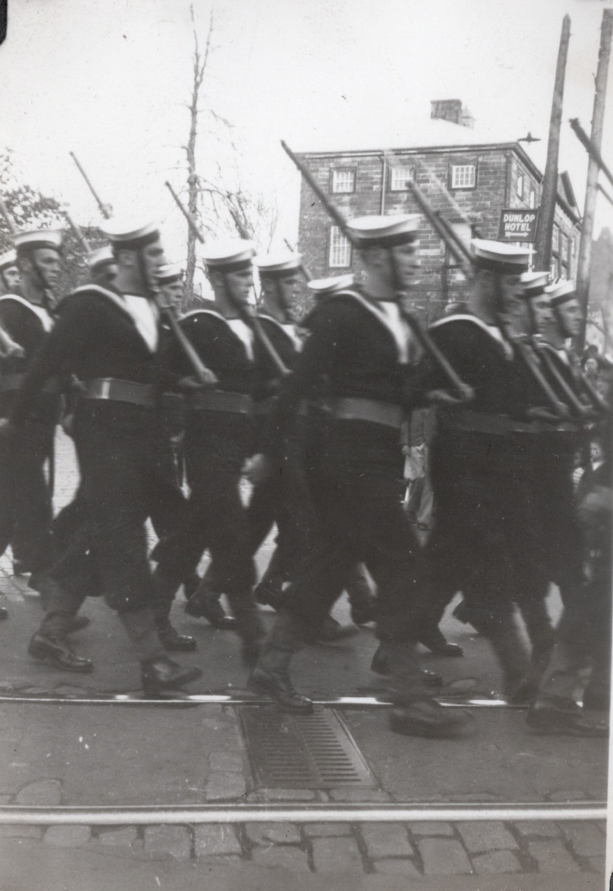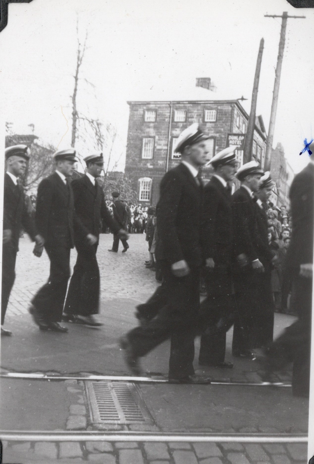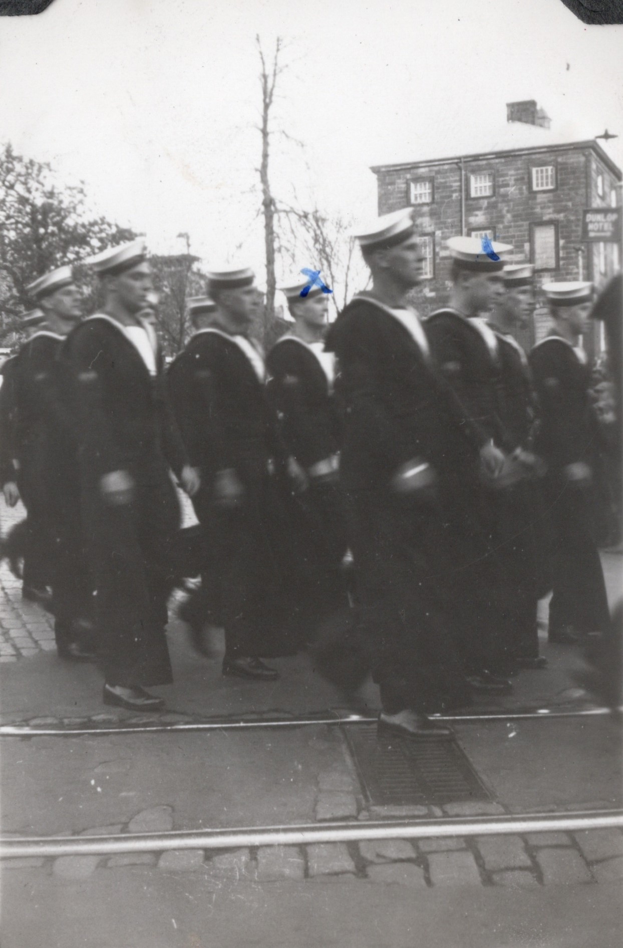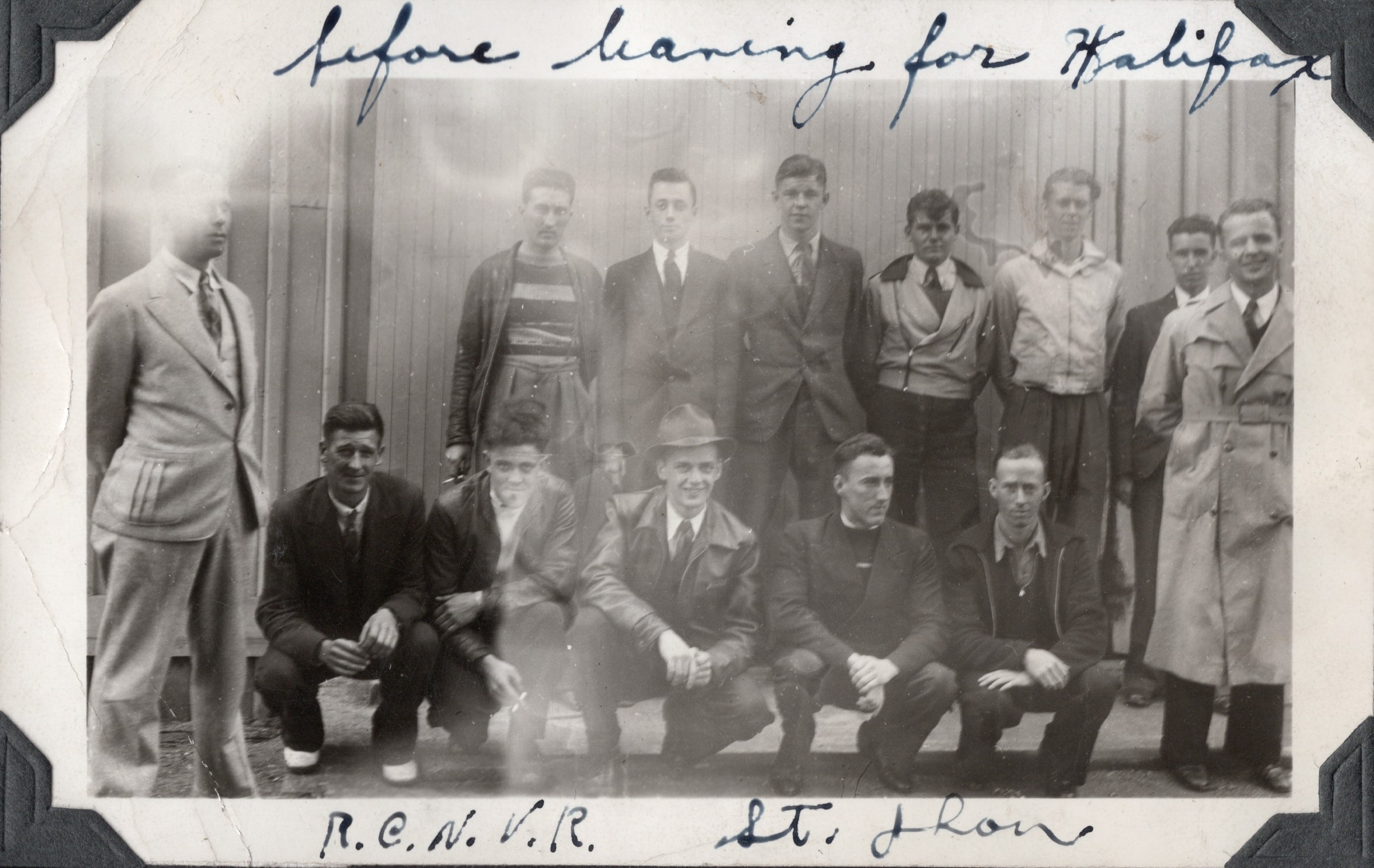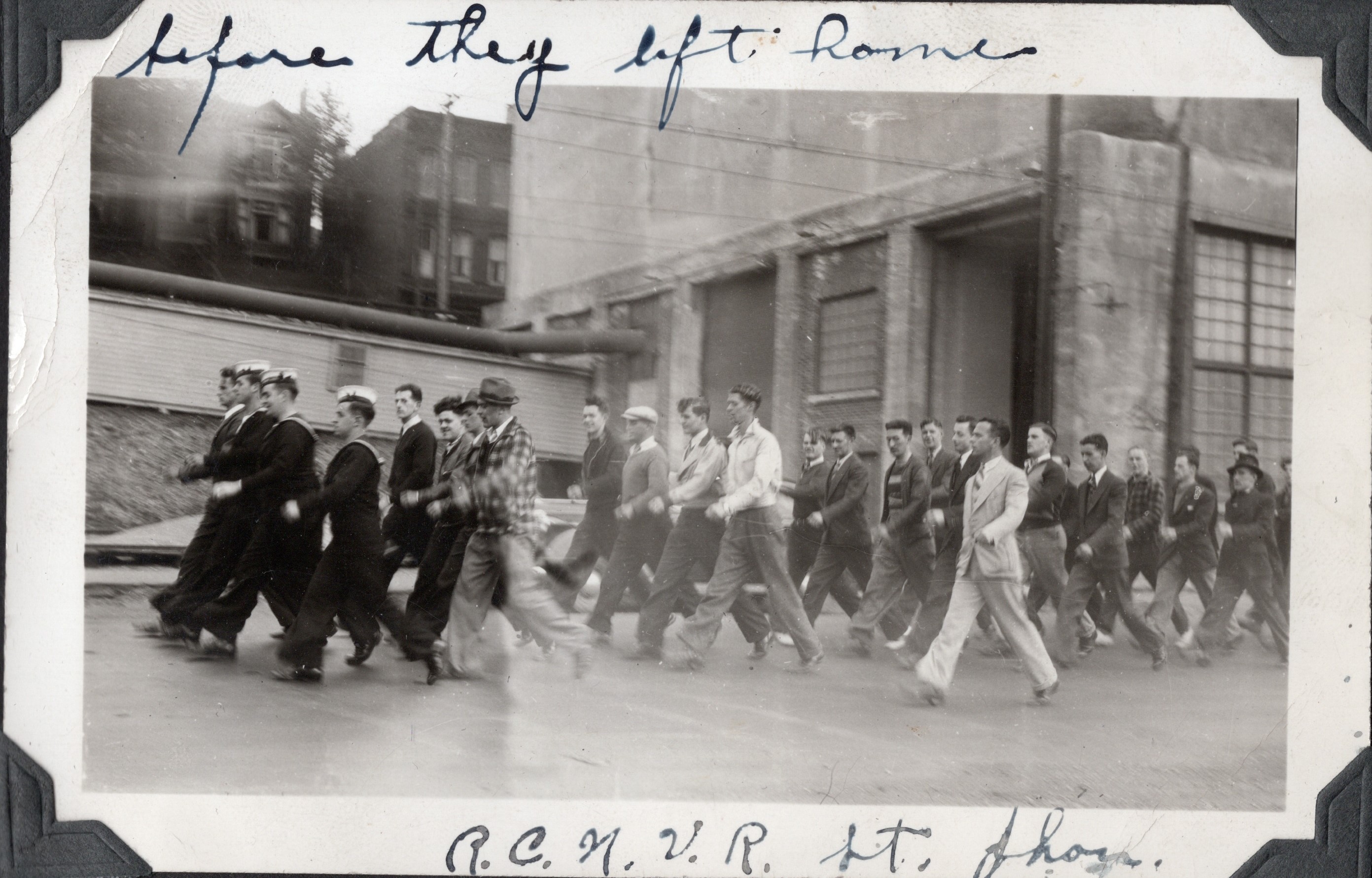 (BRU001) "Before they left home", RCNVR SAINT JOHN (BRU002) "before leaving for Halifax", RCNVR SAINT JOHN Photo album page 15 RCNVR DIVISION SAINT JOHN on parade near King's Square, Saint John, NB Note the Dunlop Hotel sign with arrow on the hydro pole in the background (BRU003) "x" "Just missed Bill Tanner. Nice back" (BRU004) "Naval Shore Patrol" (BRU005) "x's" Percy Montford (right) and Ken Jones Photo album page 21 From the collection of Robert Webster, PO, RCNVR