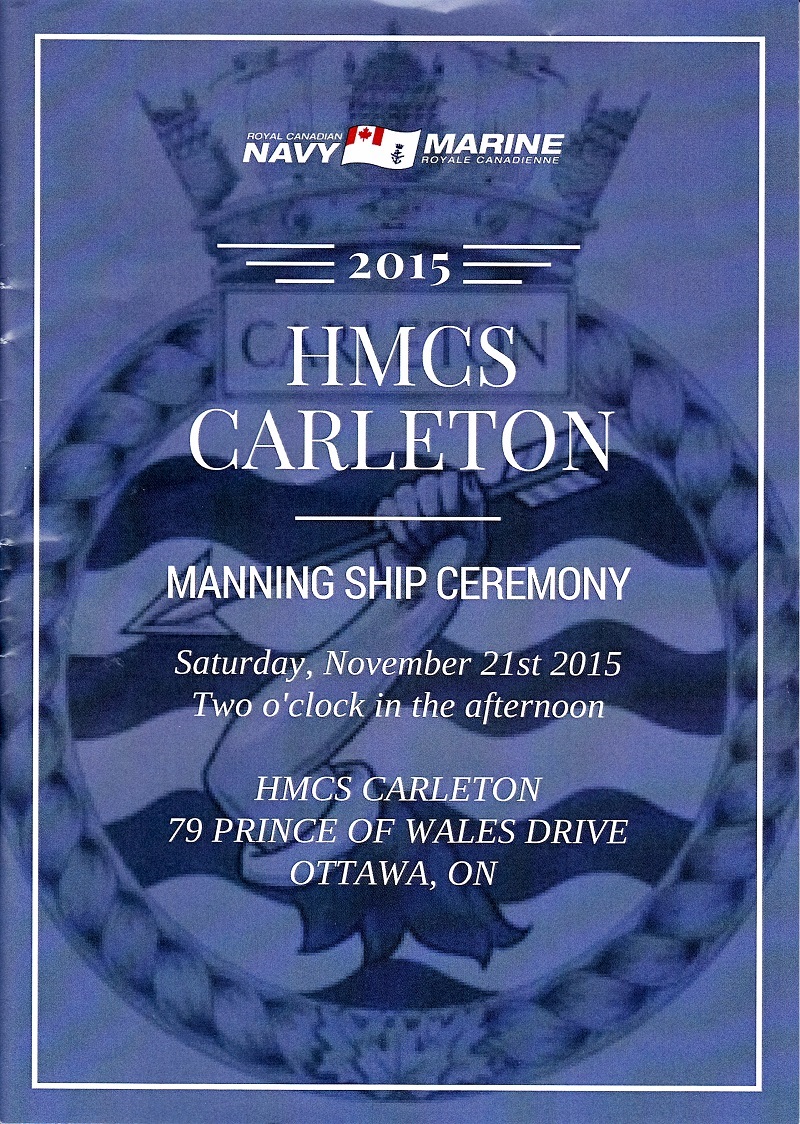 A few of the attendees at the manning ship ceremony for the new HMCS Carleton building (PM03) Cover of Manning Ship Ceremony schedule of events (PM04) Capt(N) Robert B. Duncombe, CD, Retired, Commanding Officer, HMCS Carleton, early 1970s; unknown; Lt Arvisais, from the early 1960s; SLt Glenn Carroll and LCdr Glen Calder (PM05) SLt Glenn Carrroll, LCdr Calder, Mrs. Lynn Carroll (Glenn's spouse), Lt Arvisais, unknown, SLt Andy Shaw (a former Ottawa Rough Rider), unknown, and Lt. Bill Jennings (an Ottawa lawyer) (PM06) Mrs Lynn Carroll, SLt Glenn Carroll, SLt Andy Shaw, unknown Courtesy of Peter Magwood