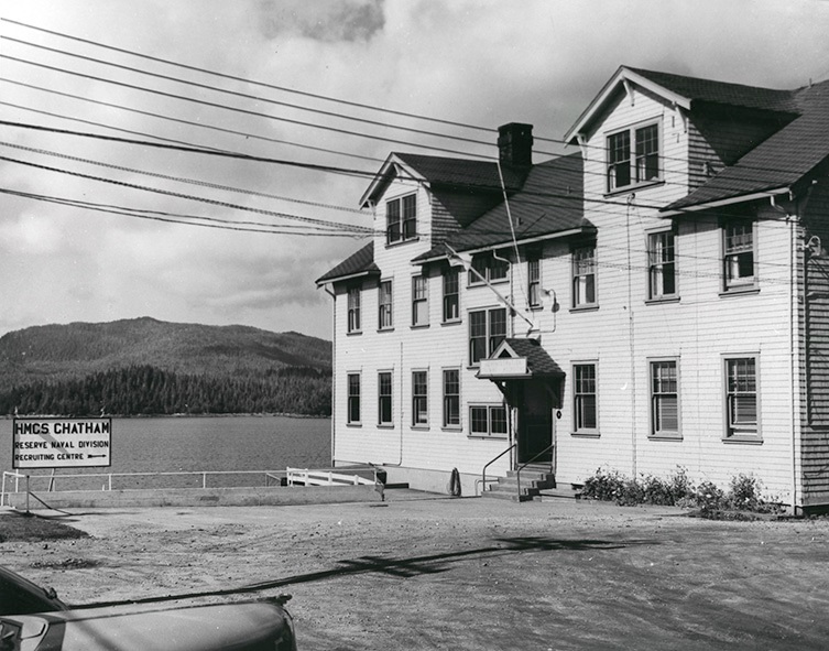 The Naval Officer In-Charge (NOIC) established in Prince Rupert, BC, in June 1940 was commissioned in 1942 as HMCS CHATHAM, named after the consort ship of HMS Discovery in which Captain George Vancouver, RN, explored the West Coast of North America in the 1790s. Although it occupied the former quarters of the local RCNVR half-company (see below), during the war CHATHAM was not considered to be a reserve division, and served instead as a routing centre for convoys and patrols along the northern British Columbia coast until paid off in August 1945.