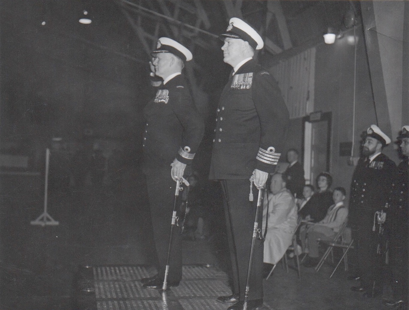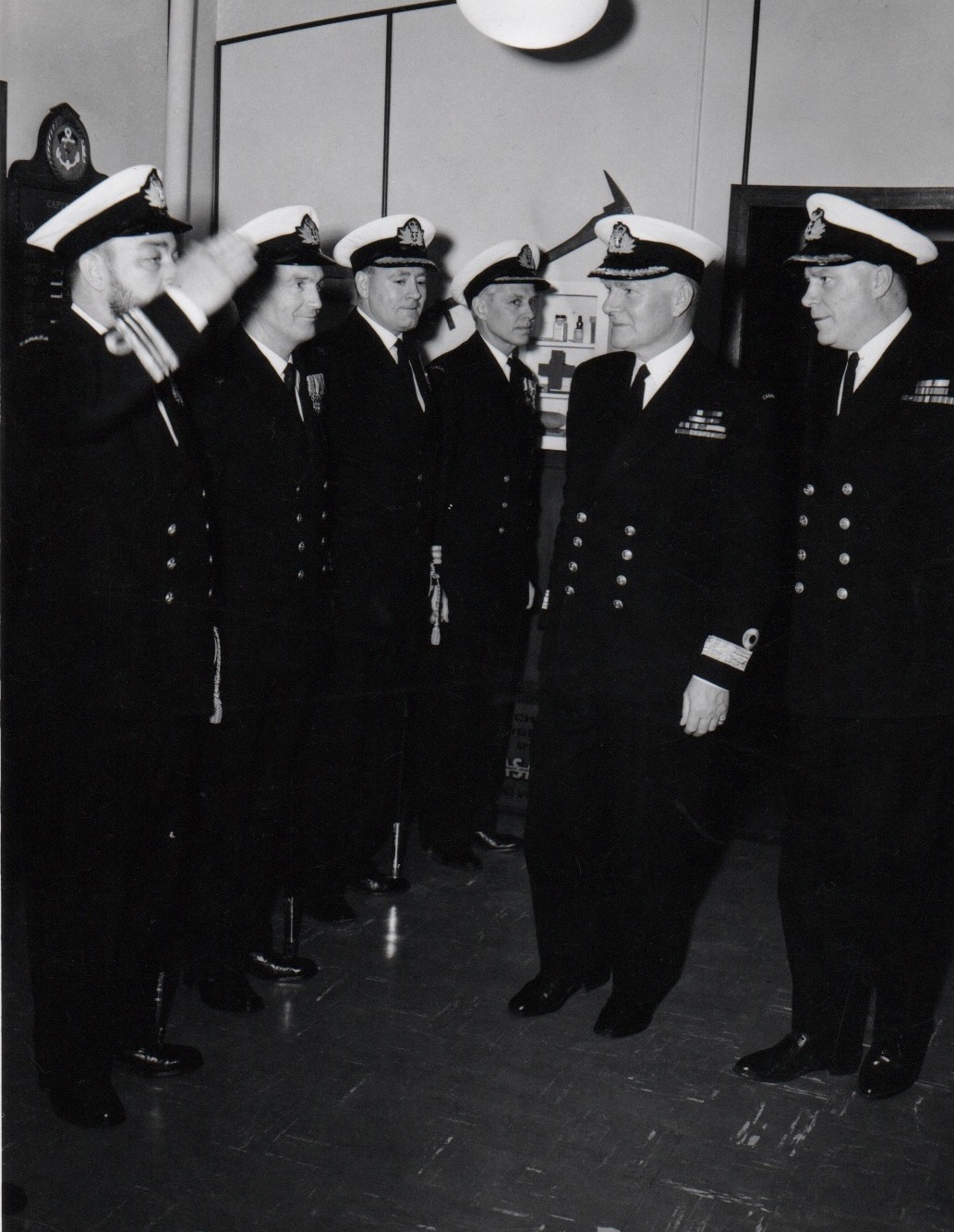 (LK111) HMCS CHIPPAWA Apr 1965 Inspection of HMCS CHIPPAWA by Cmdre Taylor and Capt Dangerfield - Apr 1965. LCDR Kennedy with sword in lower right corner of photo (LK112) L-R: LCdr E.M.L. Kennedy, LCdr F.B.Bradshaw, Cdr R. Godbehere, Cdr Findlay greeting Cmdre Taylor and Capt Dangerfield, Commanding Officer HMCS CHIPPAWA during the Apr 1965 inspection of HMCS CHIPPAWA From the collection of LCdr Lionel Kennedy, RCN Courtesy of Barbara Holliday