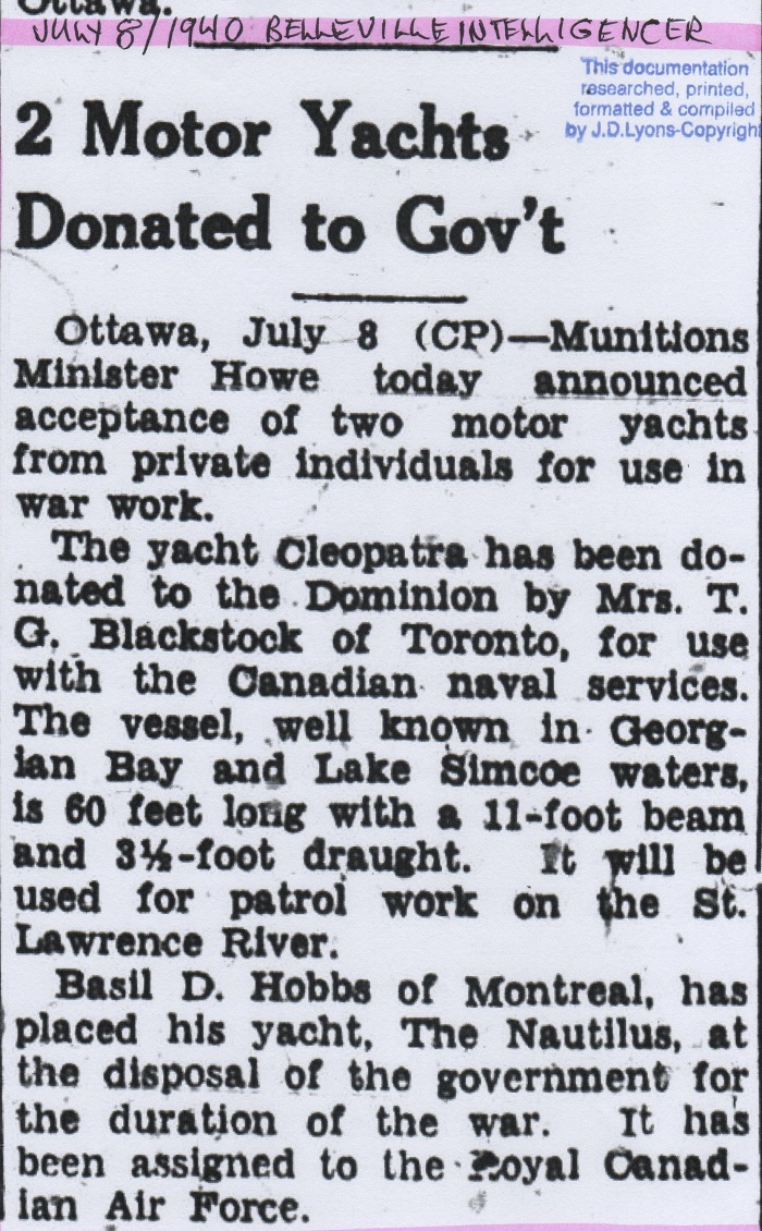HMCS CLEOPATRA began her career as a steam yacht for the family of T.G. Blackstock. The Cleopatra was donated to the RCN to aid in the war effort. On 27 Jul 1940 patrol vessel HMCS CLEOPATRA assigned to Quebec City, Quebec.
